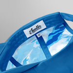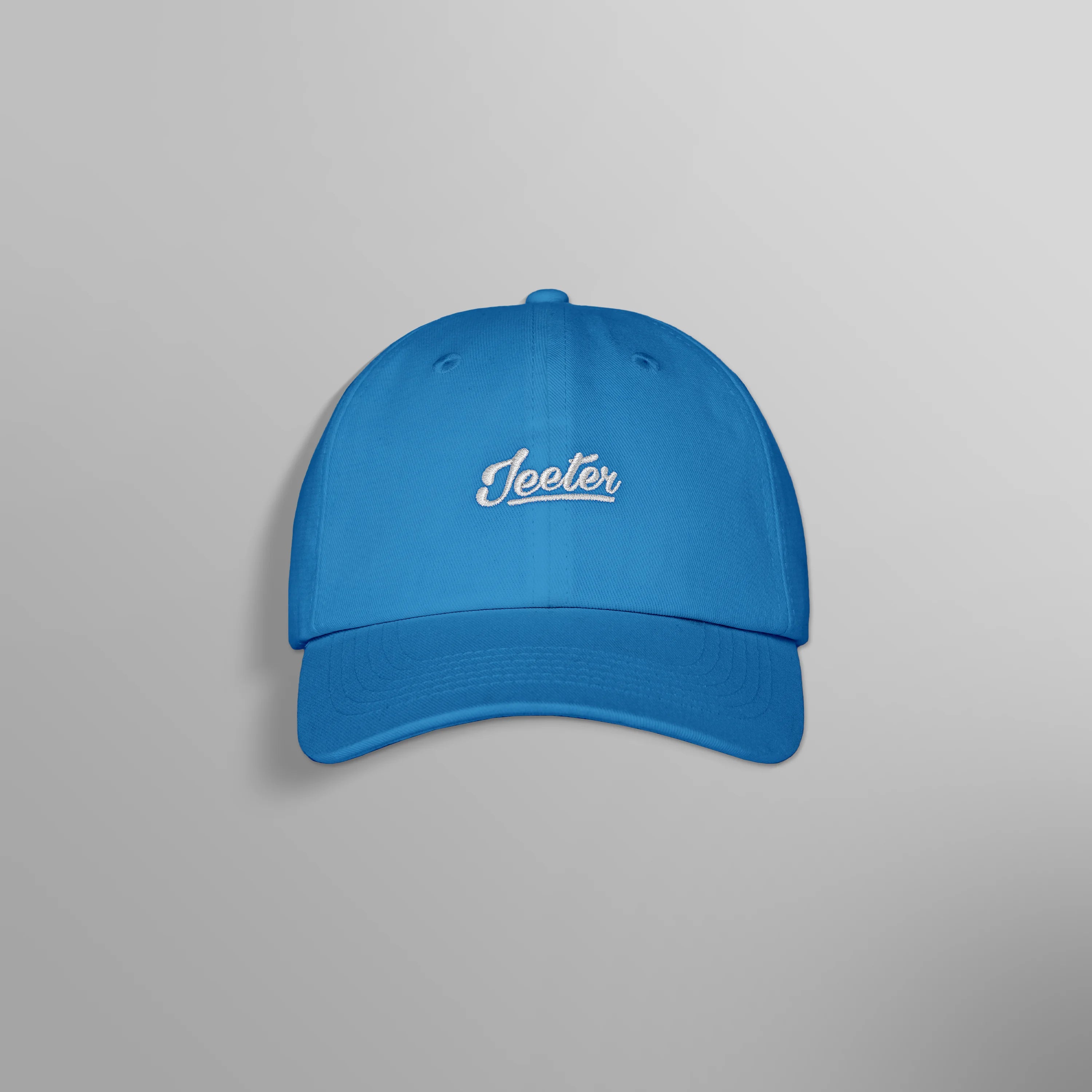 Our Clouded Blue Hat with a fitted crown and a white direct “Jeeter” logo embroidery has a fun clouded lining and an adjustable strap.