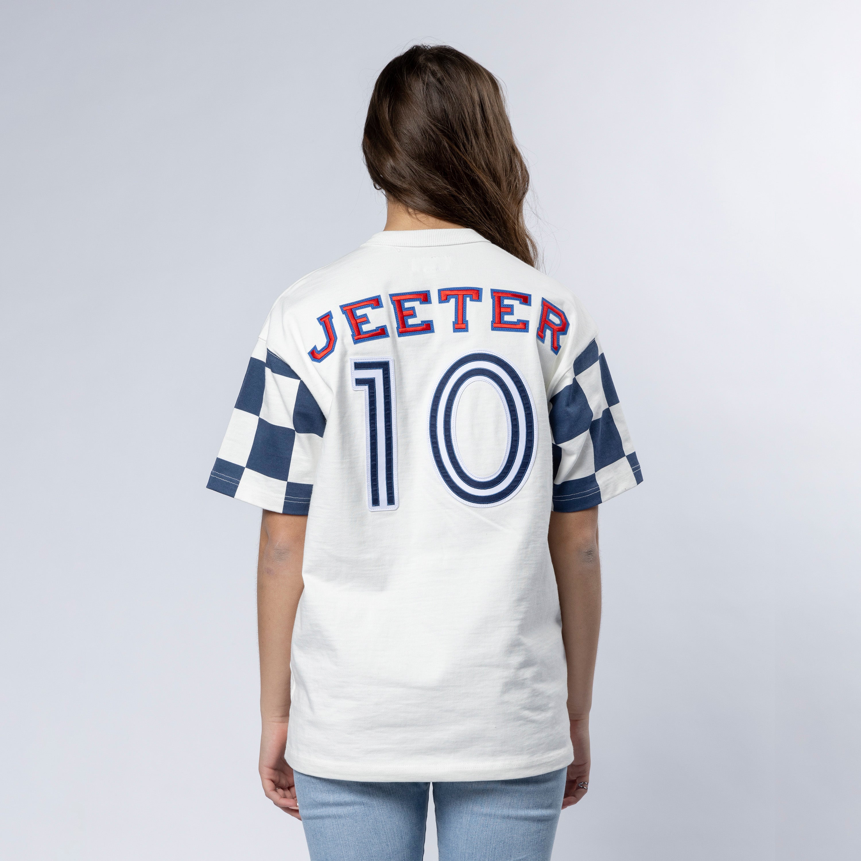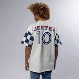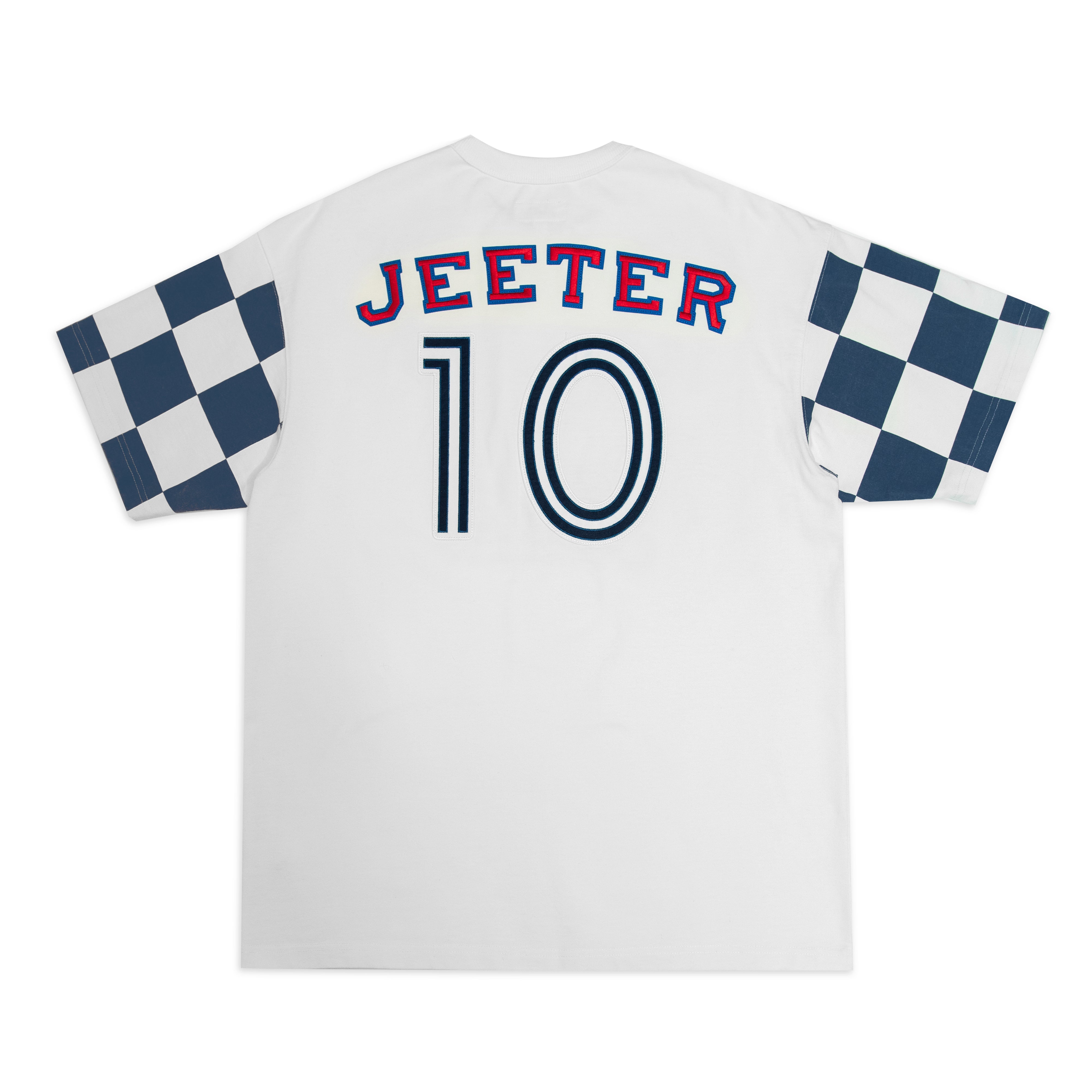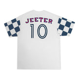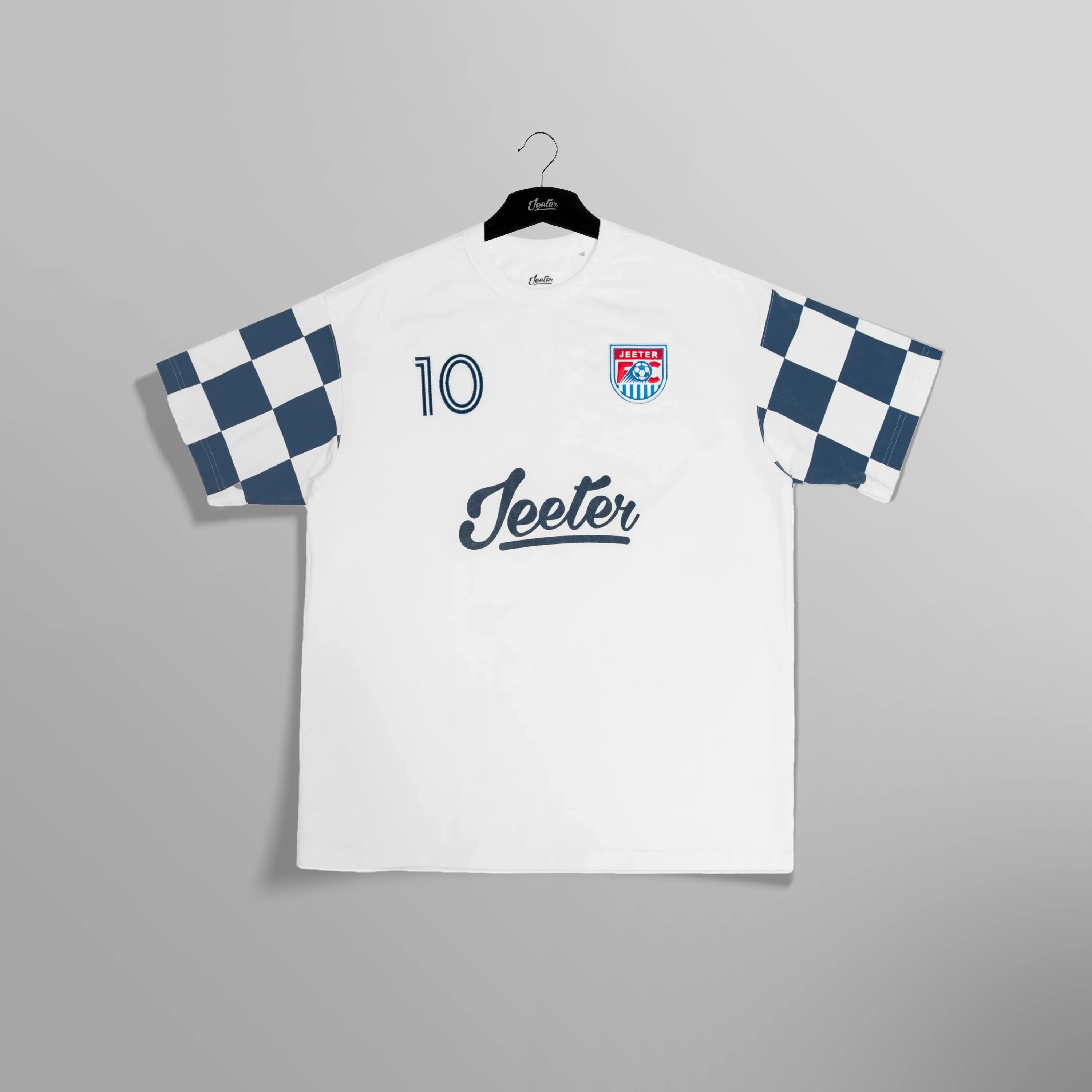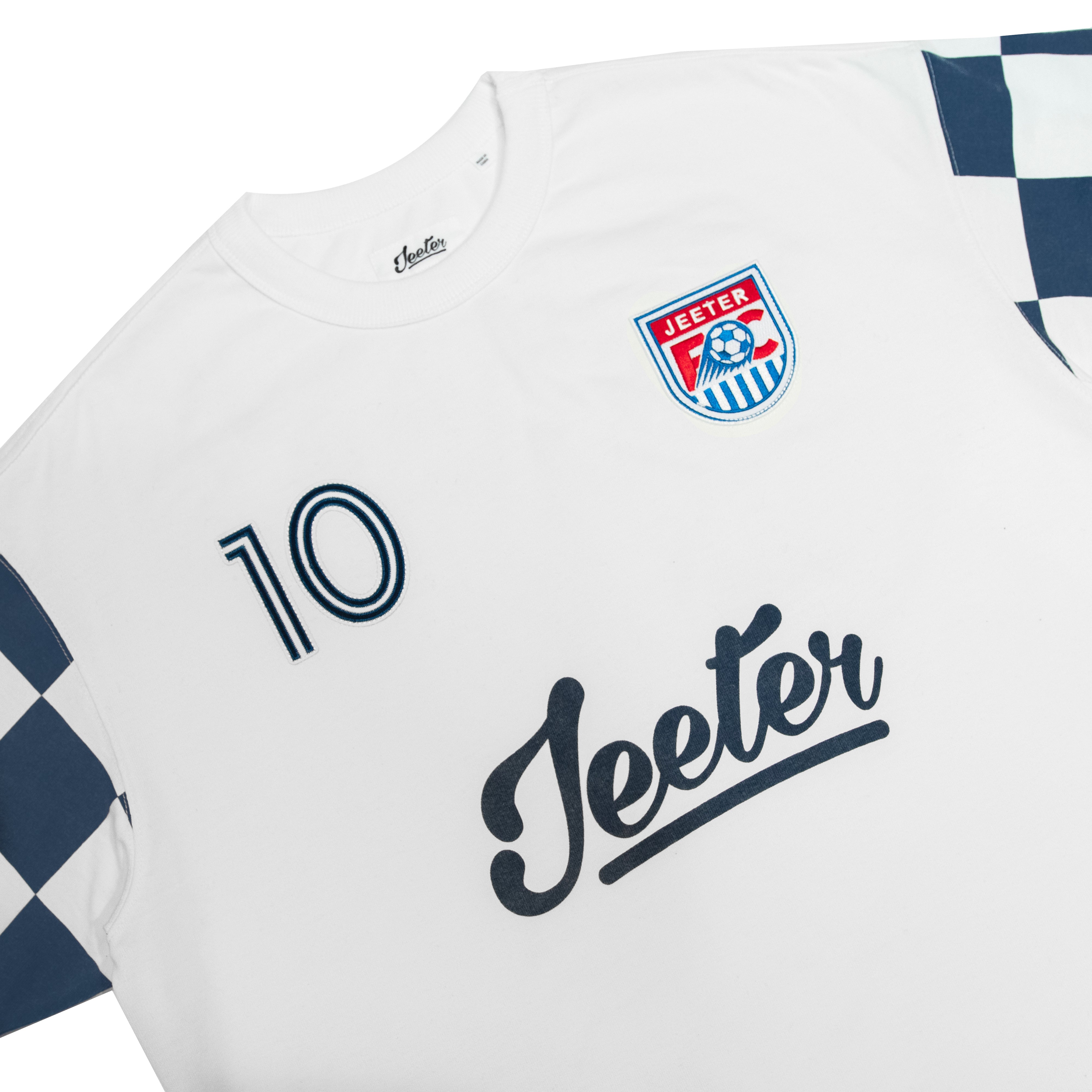Heavier weight 100% cotton crewneck t-shirt with bound collar construction, contrast checkered sleeves, our Jeeter FC Crest patch, #10 patch and rear game logo appliques.