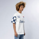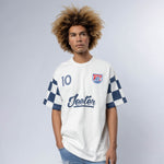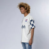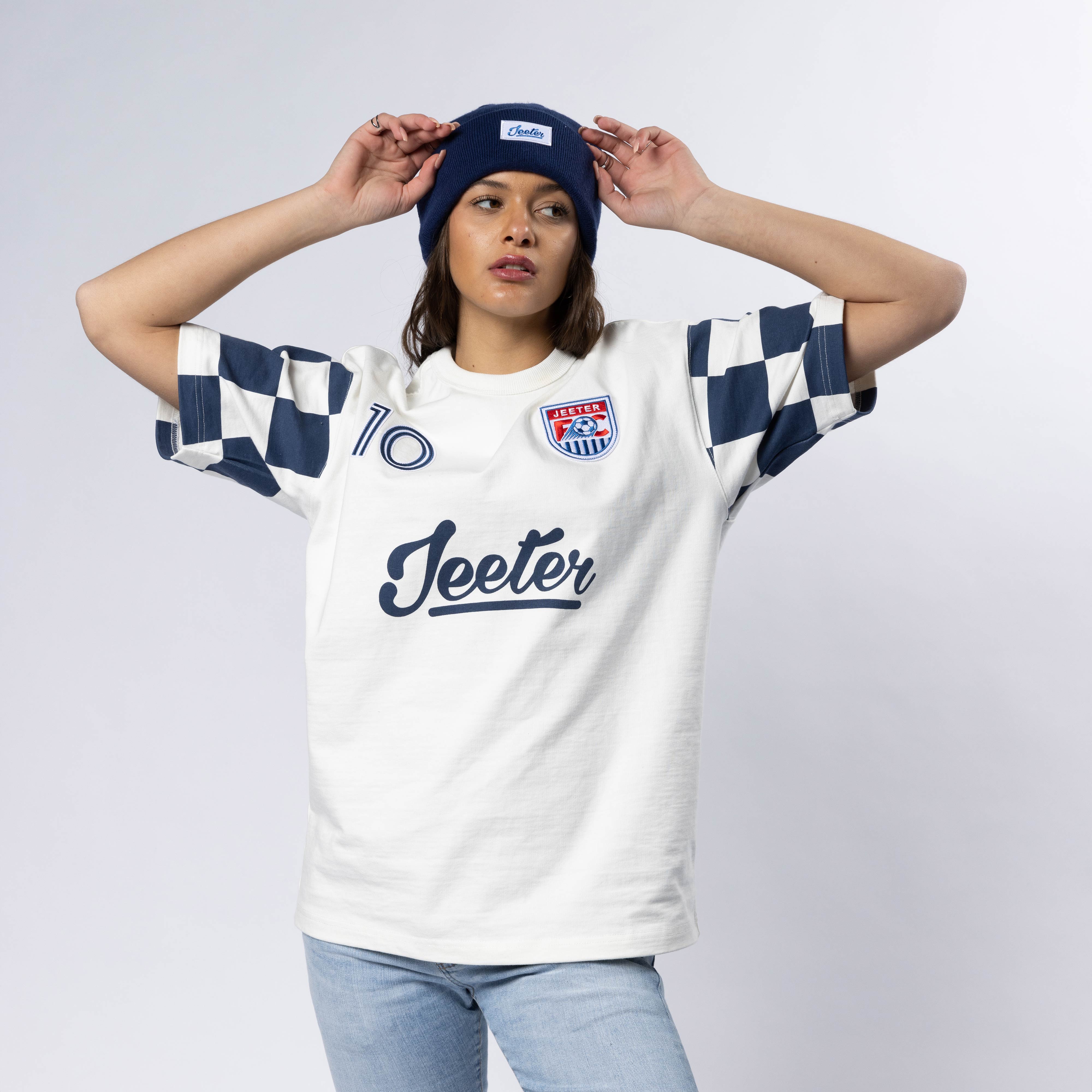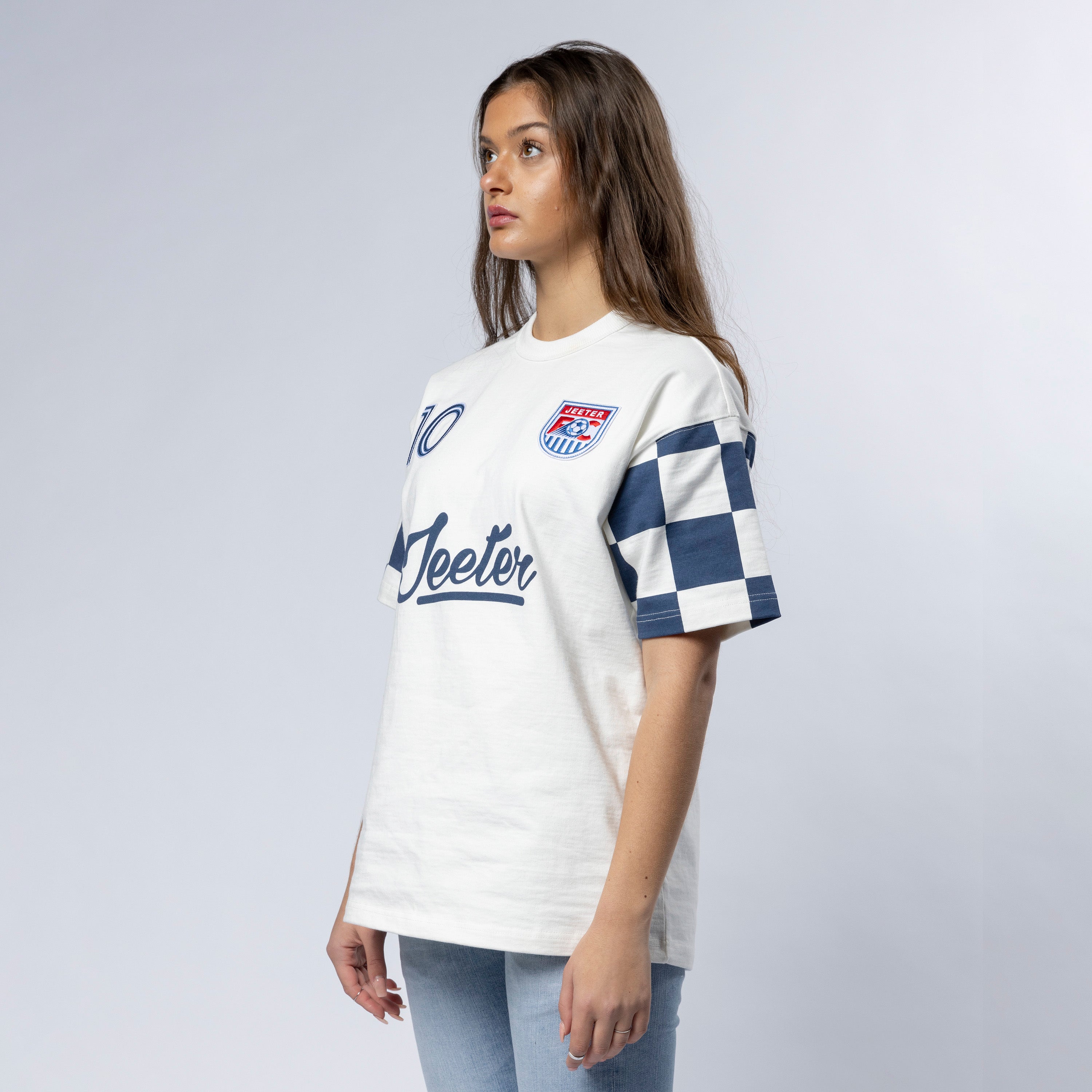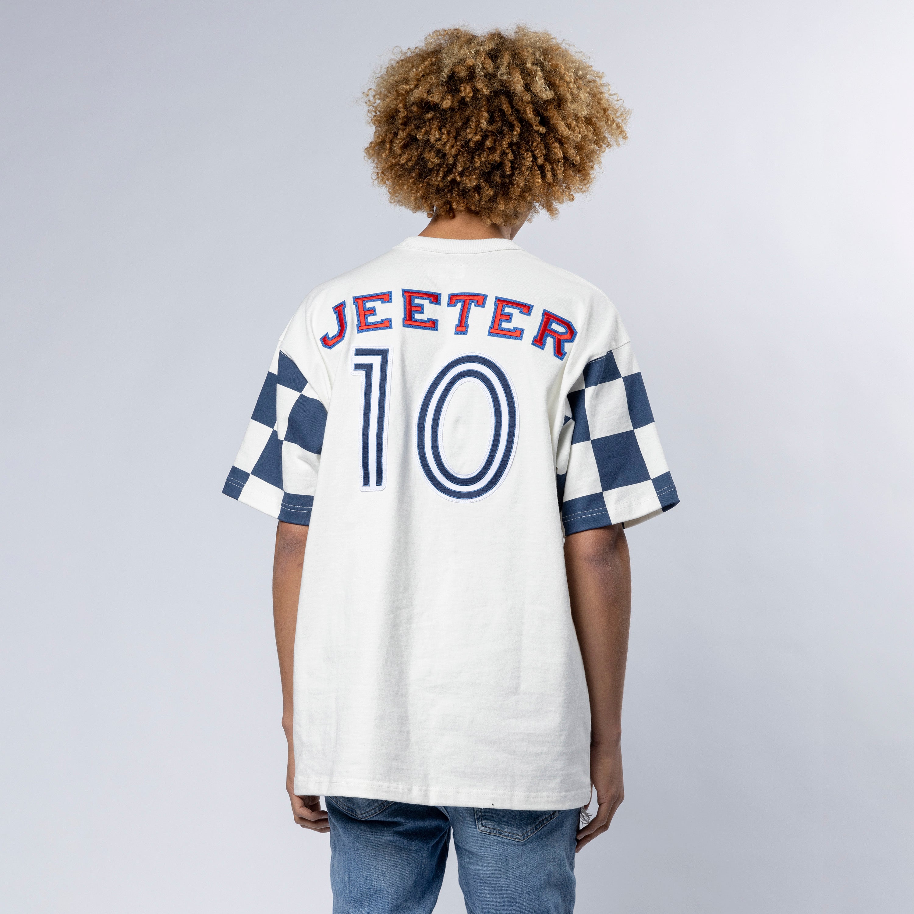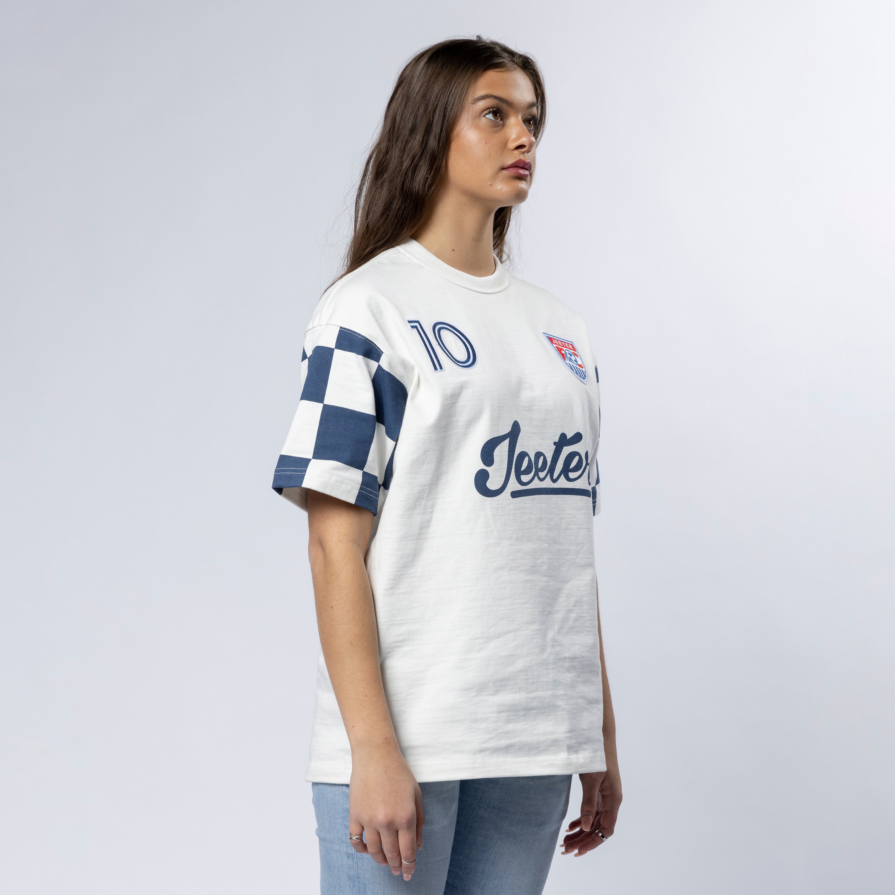 Heavier weight 100% cotton crewneck t-shirt with bound collar construction, contrast checkered sleeves, our Jeeter FC Crest patch, #10 patch and rear game logo appliques.