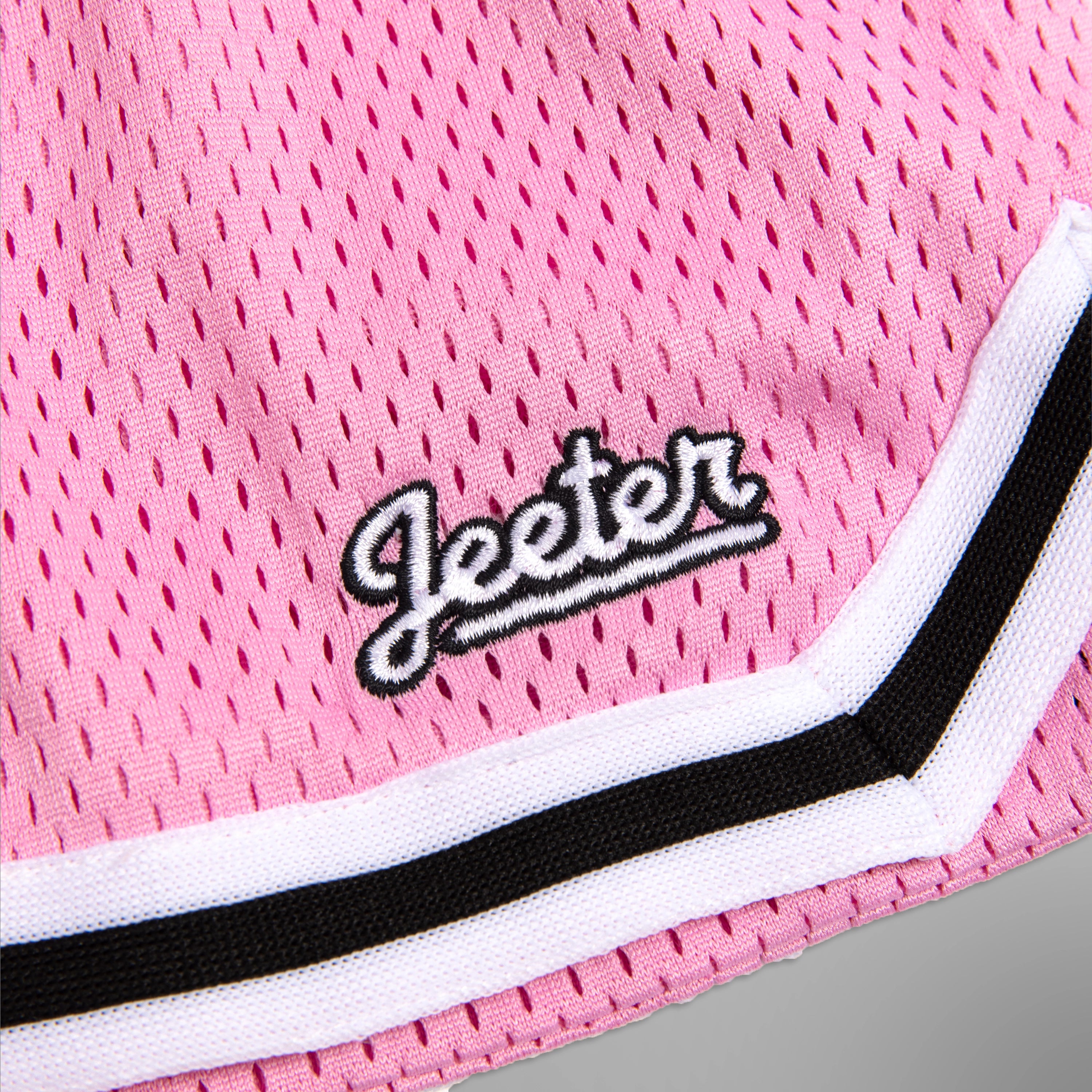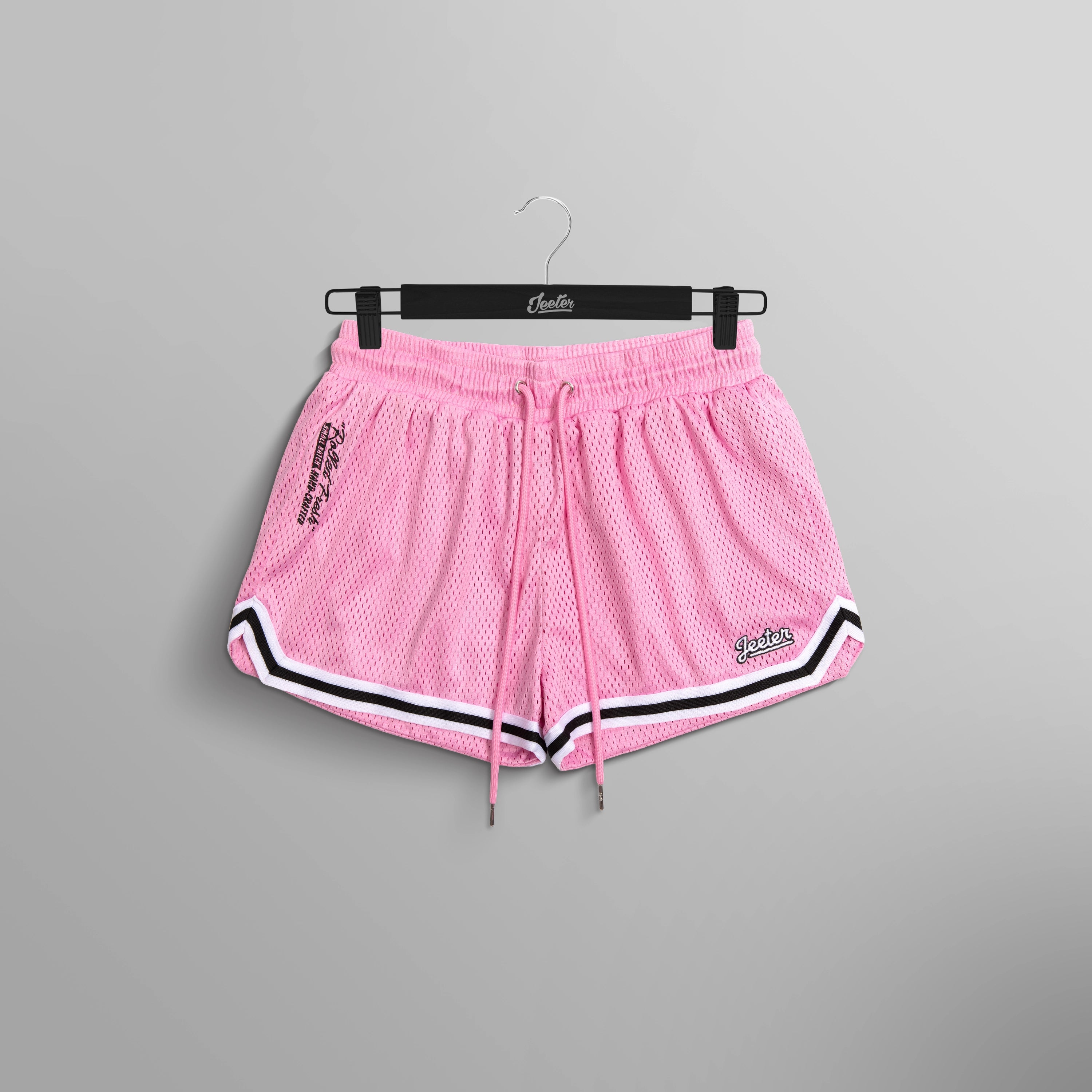 Dipped in frosting and made to move, these pink mesh shorts bring the flavor with script embroidery at the hem, a black and white trim and just the right amount of drip. Sweet, sporty, and made to stand out.