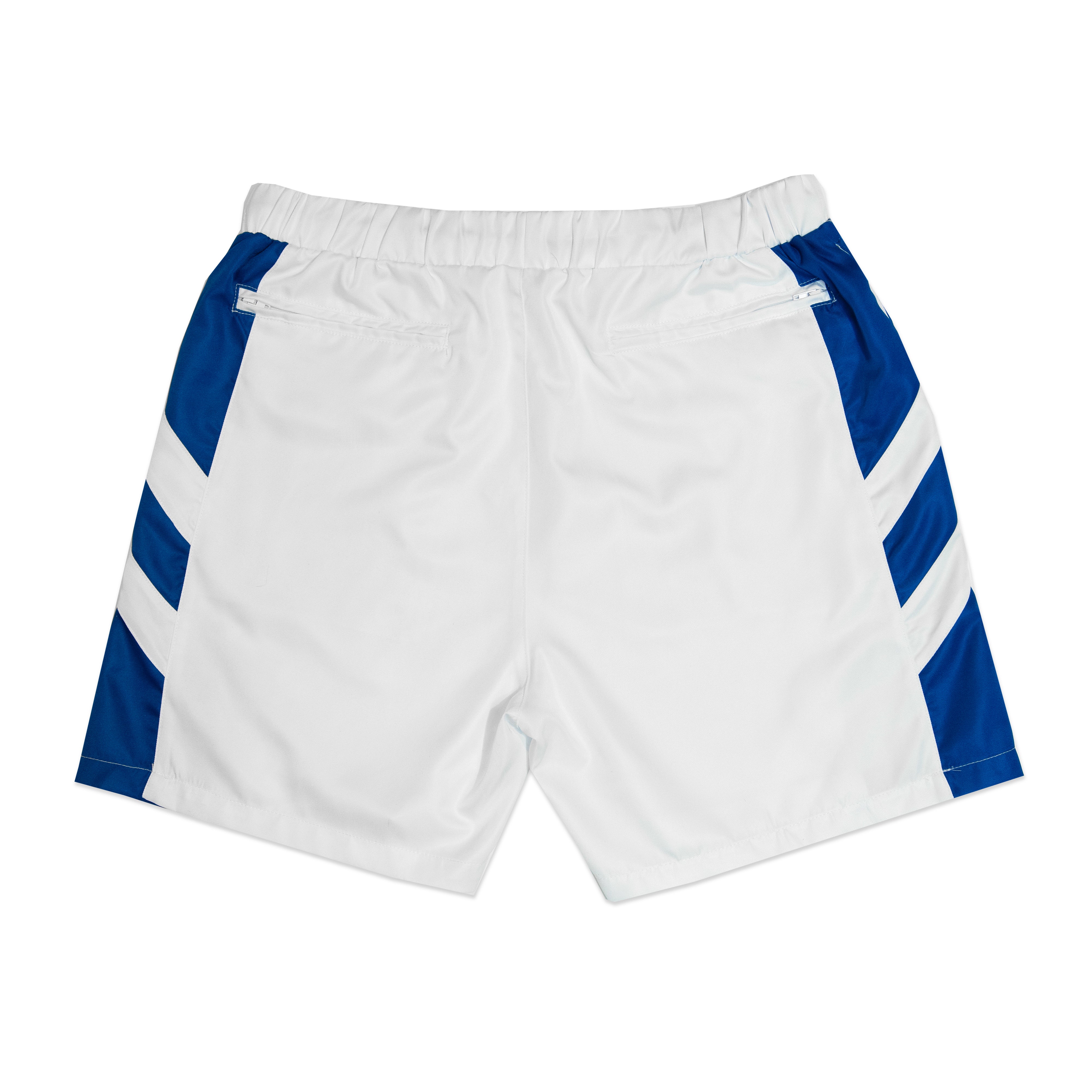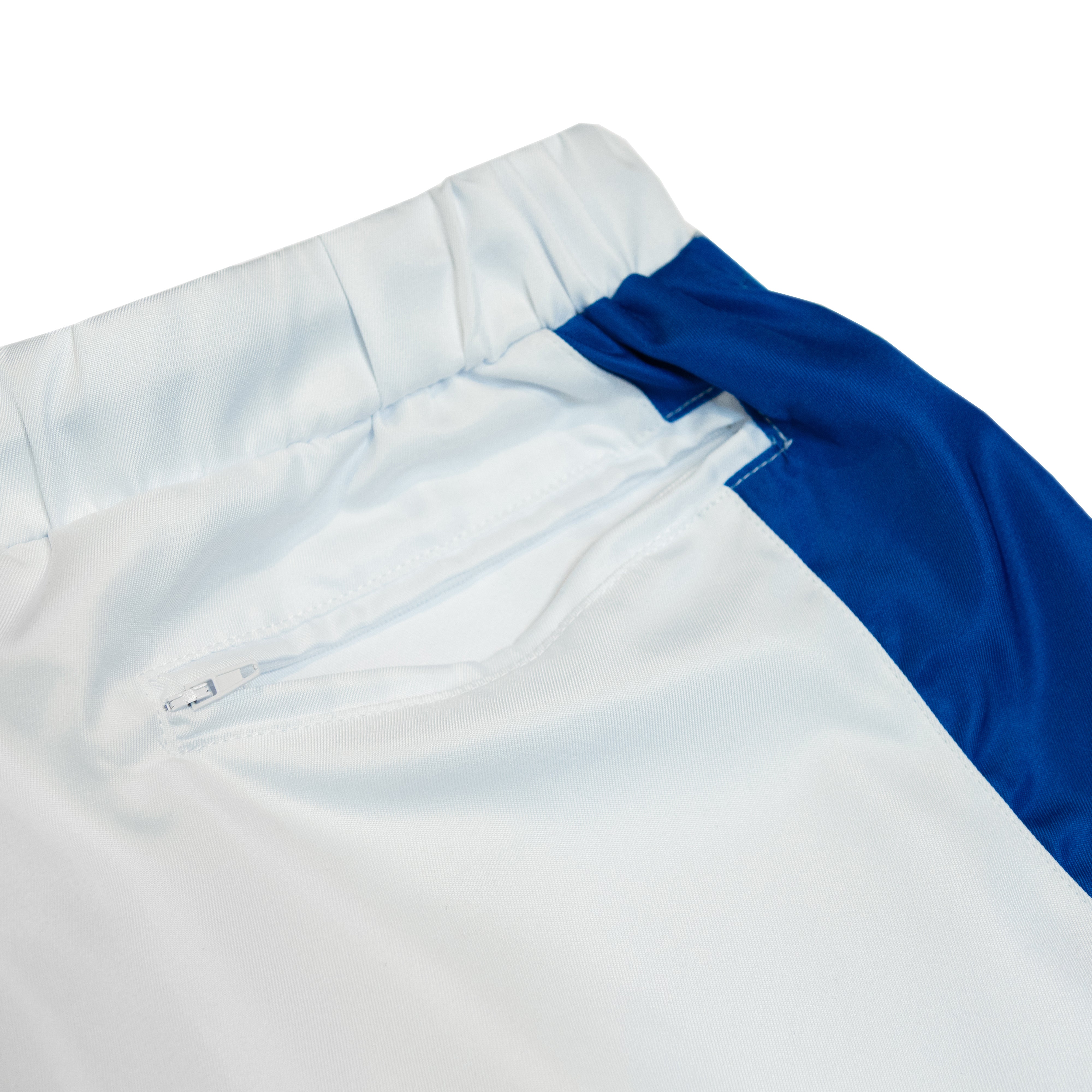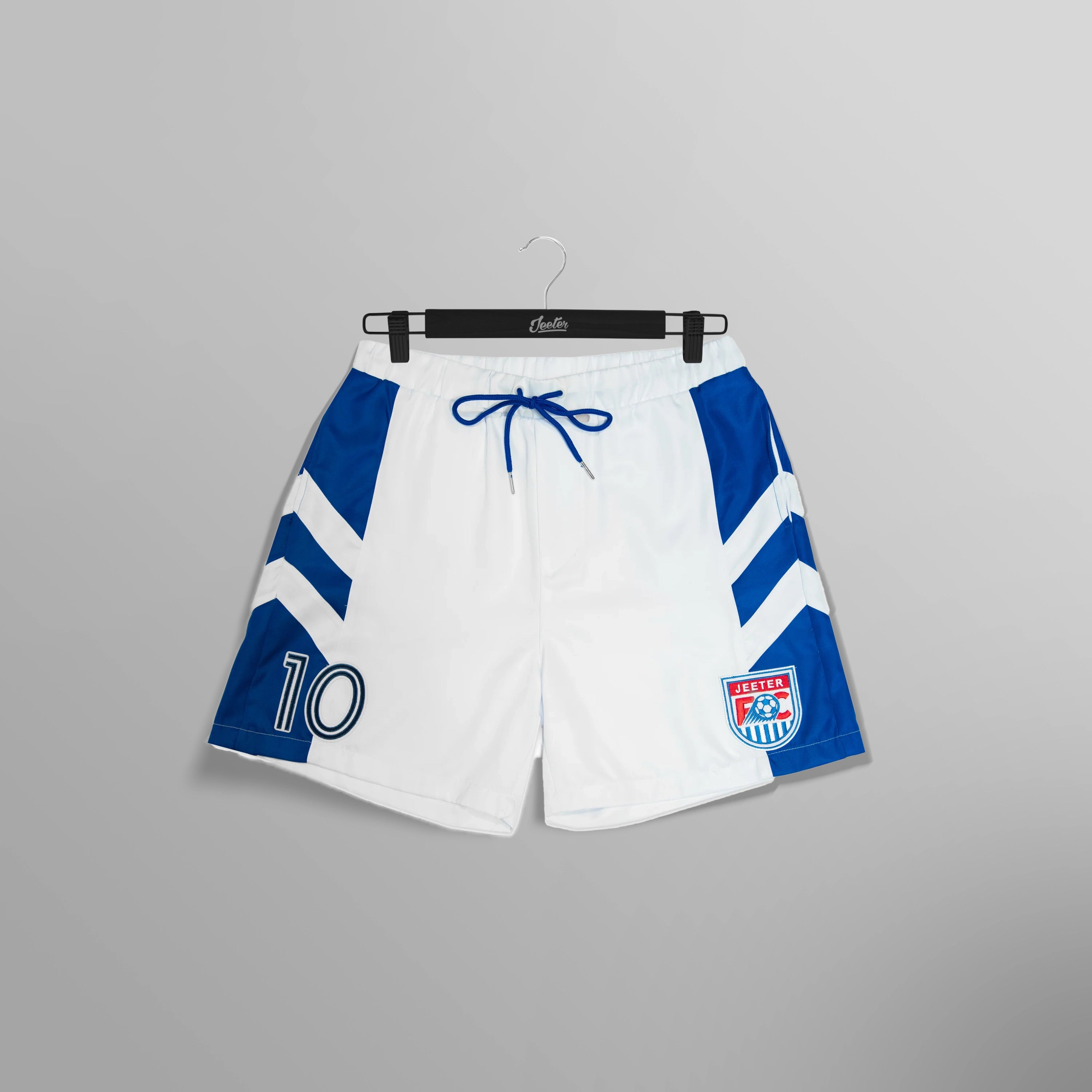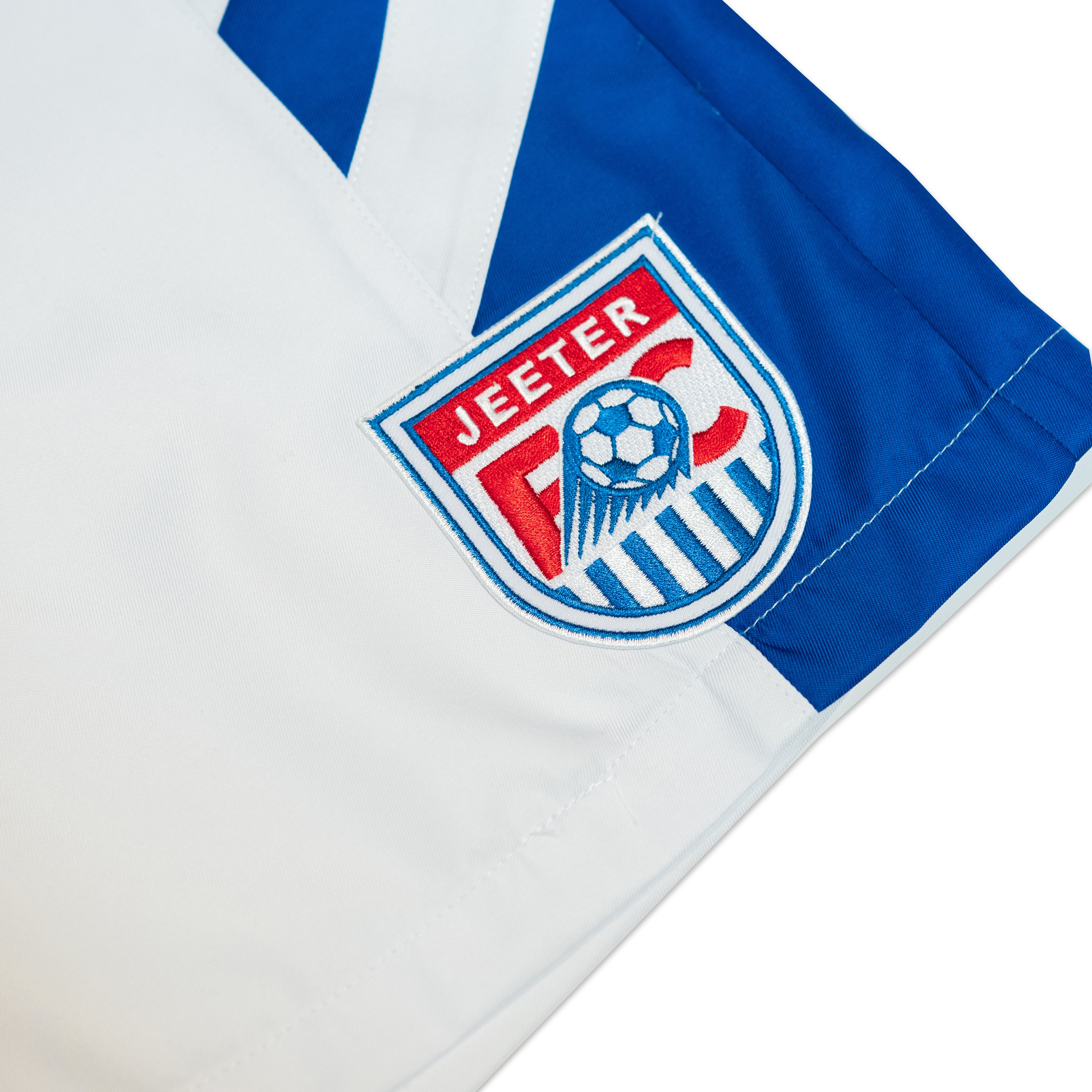 100% poly twill 2-tone game shorts with moisture wicking and dry quick properties. This short features our chevron construction over the side seam and contrast blue piecing with Jeeter FC crest patch and captain #10 patch with double rear welt pockets.