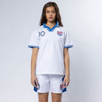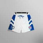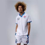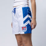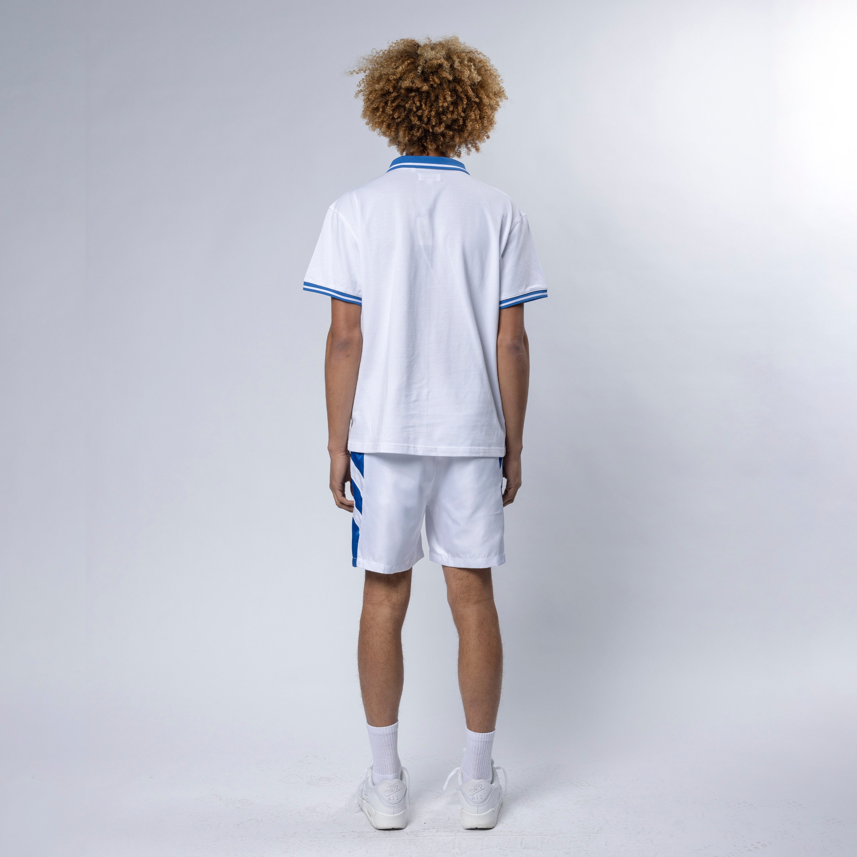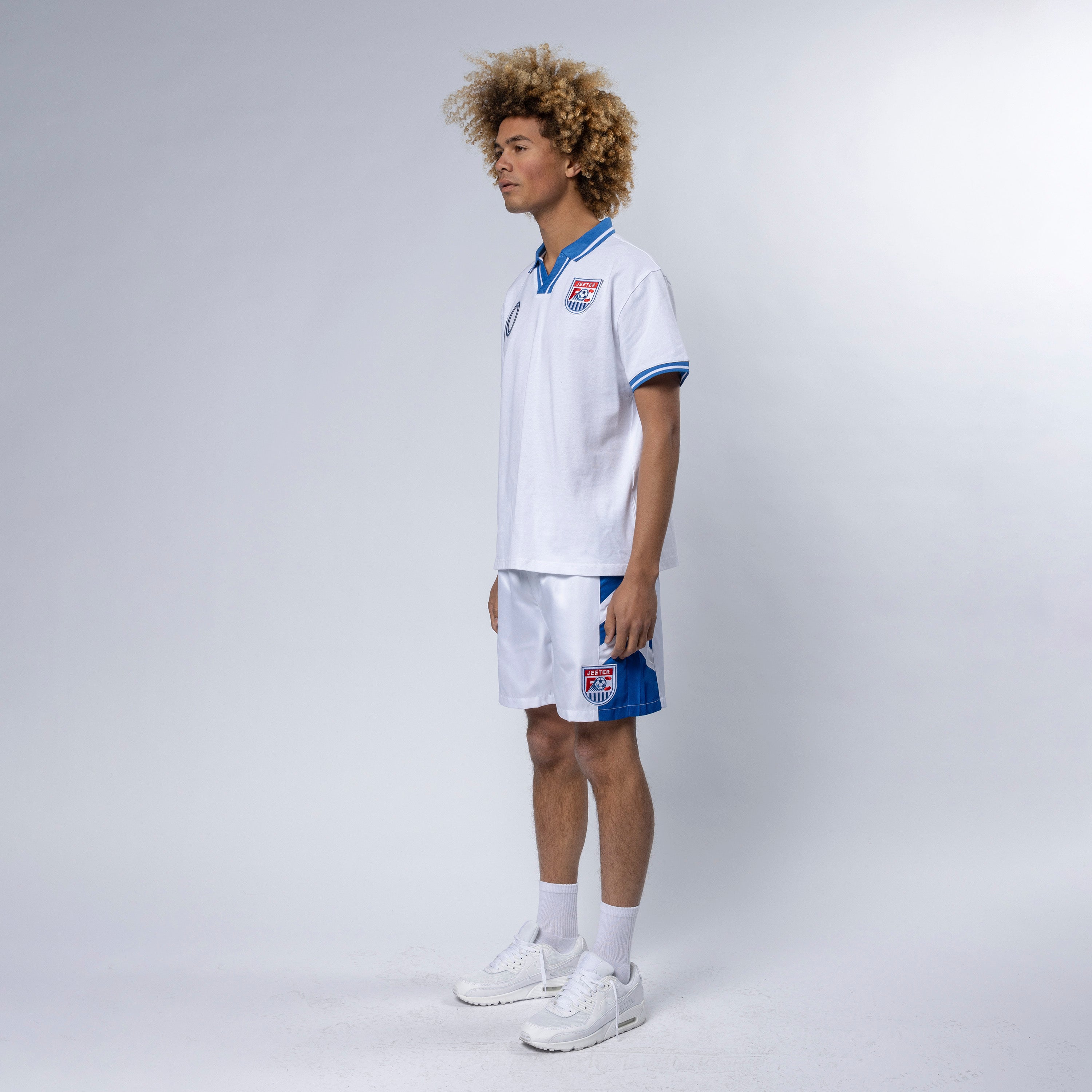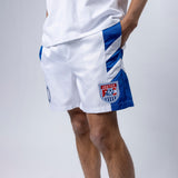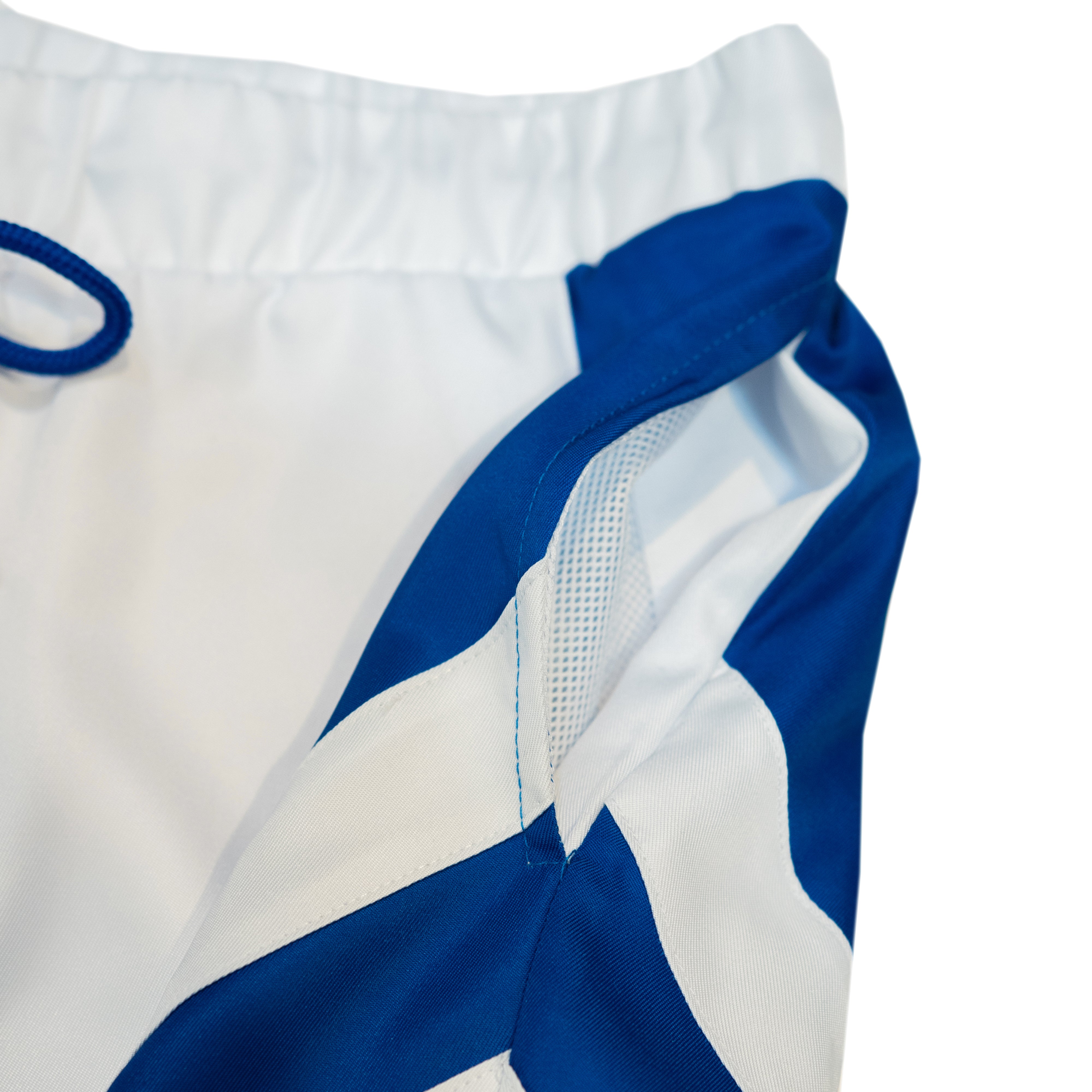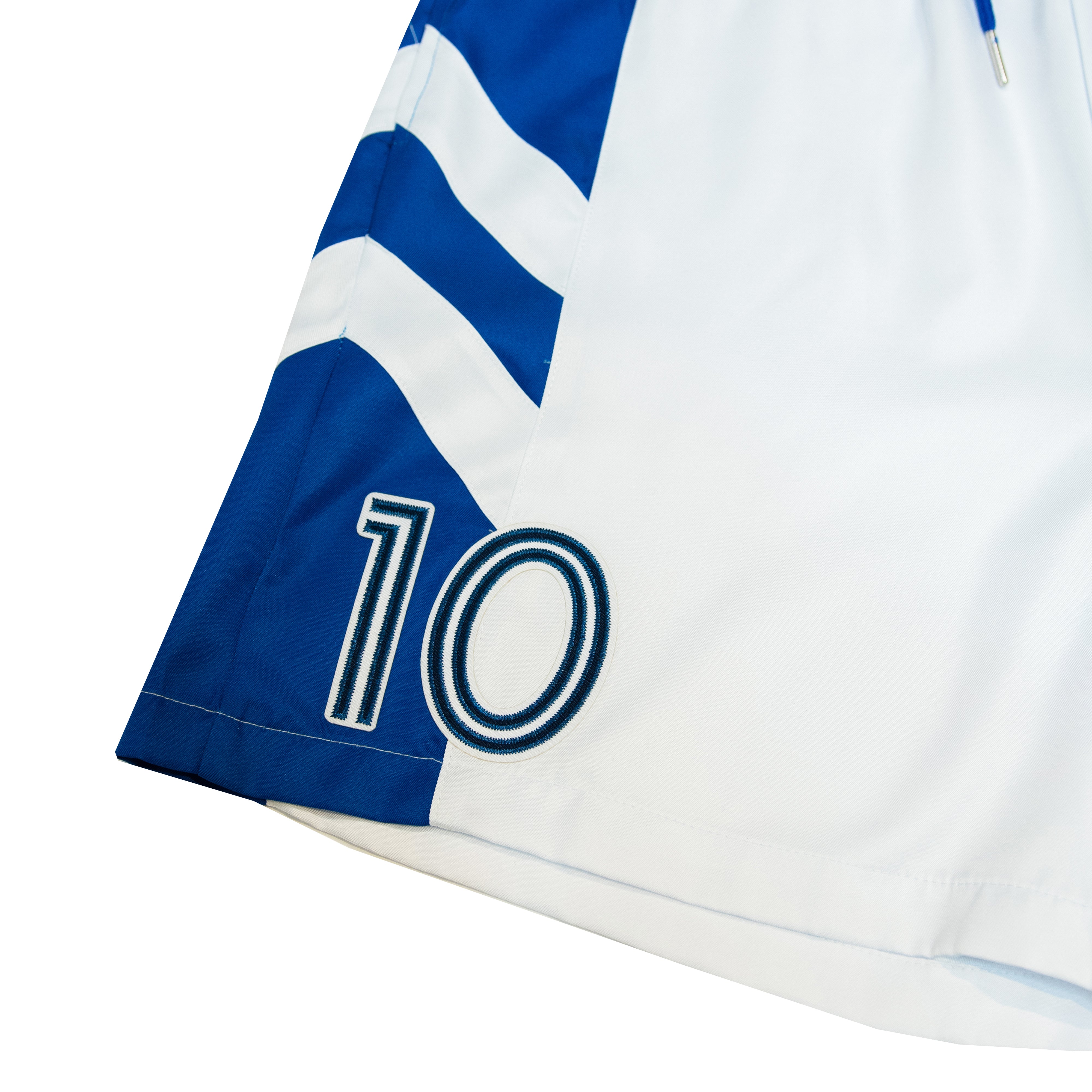 100% poly twill 2-tone game shorts with moisture wicking and dry quick properties. This short features our chevron construction over the side seam and contrast blue piecing with Jeeter FC crest patch and captain #10 patch with double rear welt pockets.