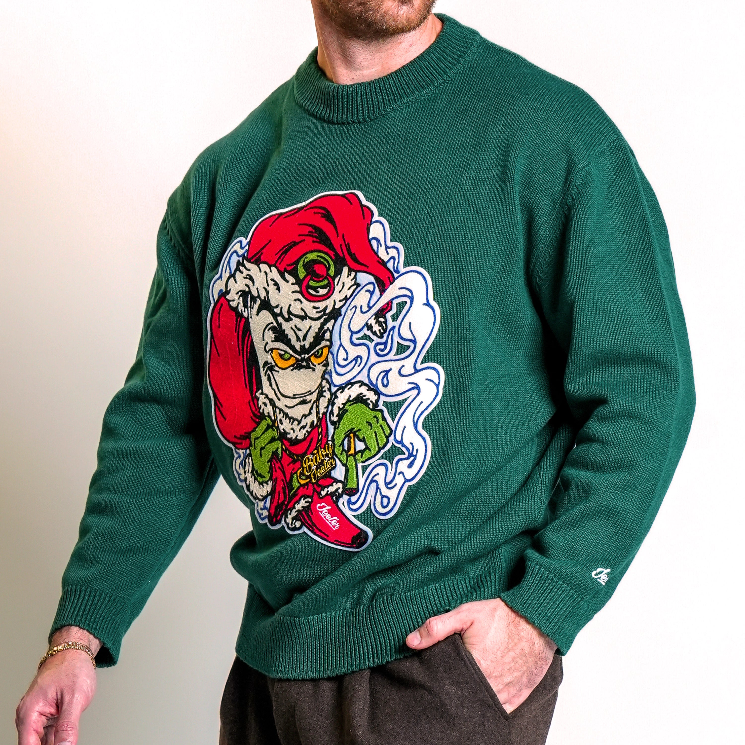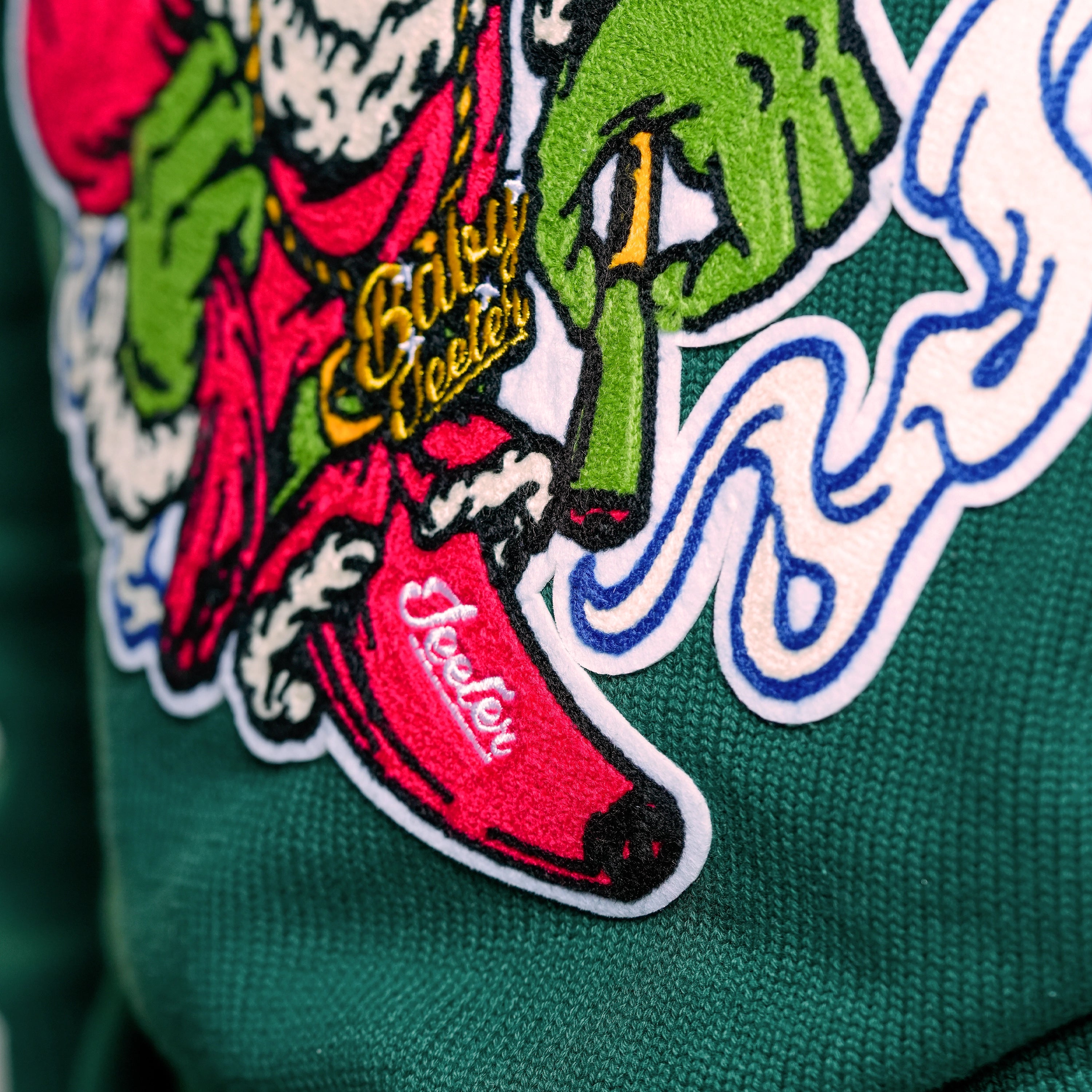 Your essential piece of holiday nostalgia is here. The Jeeter Graphic Sweater blends the cozy comfort of a modern flat-knit sweater with the vintage charm of classic holiday style, designed to be the statement of your season. Crafted from a soft wool-cotton blend, it offers warmth without the weight and features a large, high-quality chenille patch front and center, giving it that perfect elevated "ugly Christmas sweater" aesthetic. It comes in a relaxed, comfortable crew-neck fit that is perfect for layering or wearing solo. This piece is retro, whimsical, and unmistakably festive—a must-have for holiday parties and memorable photo opportunities.
