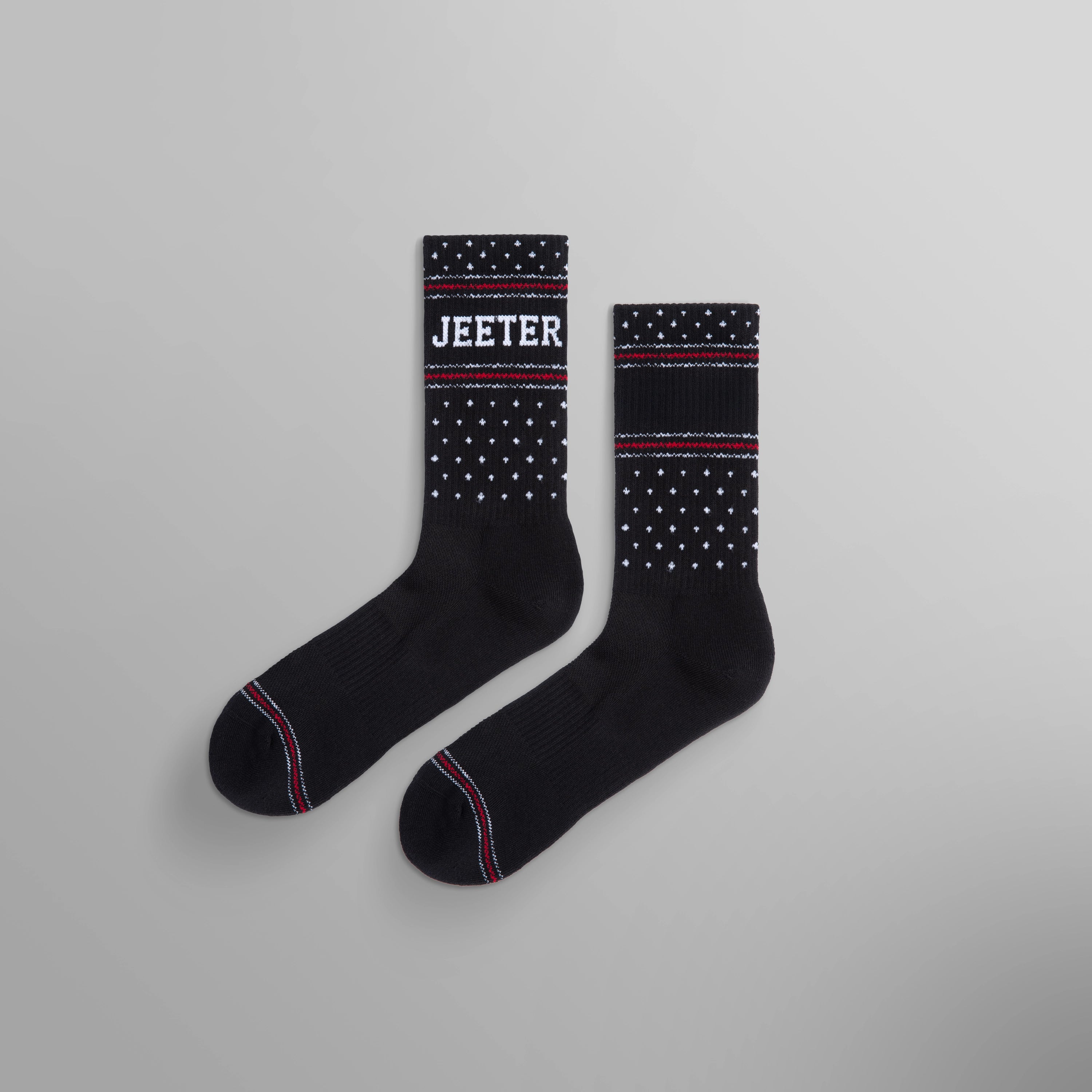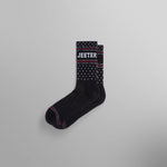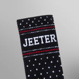 Subtle holiday charm meets classic Jeeter style. The Black Speckled Socks are your cozy-yet-stylish answer to winter footwear. Crafted in a soft black knit, the design incorporates a subtle, festive pattern woven throughout the fabric, creating a unique texture and seasonal appeal. The top cuff features the white JEETER logo, standing out against the dark background. These socks are perfect for wearing with boots or gifting to someone who appreciates a muted but festive details.