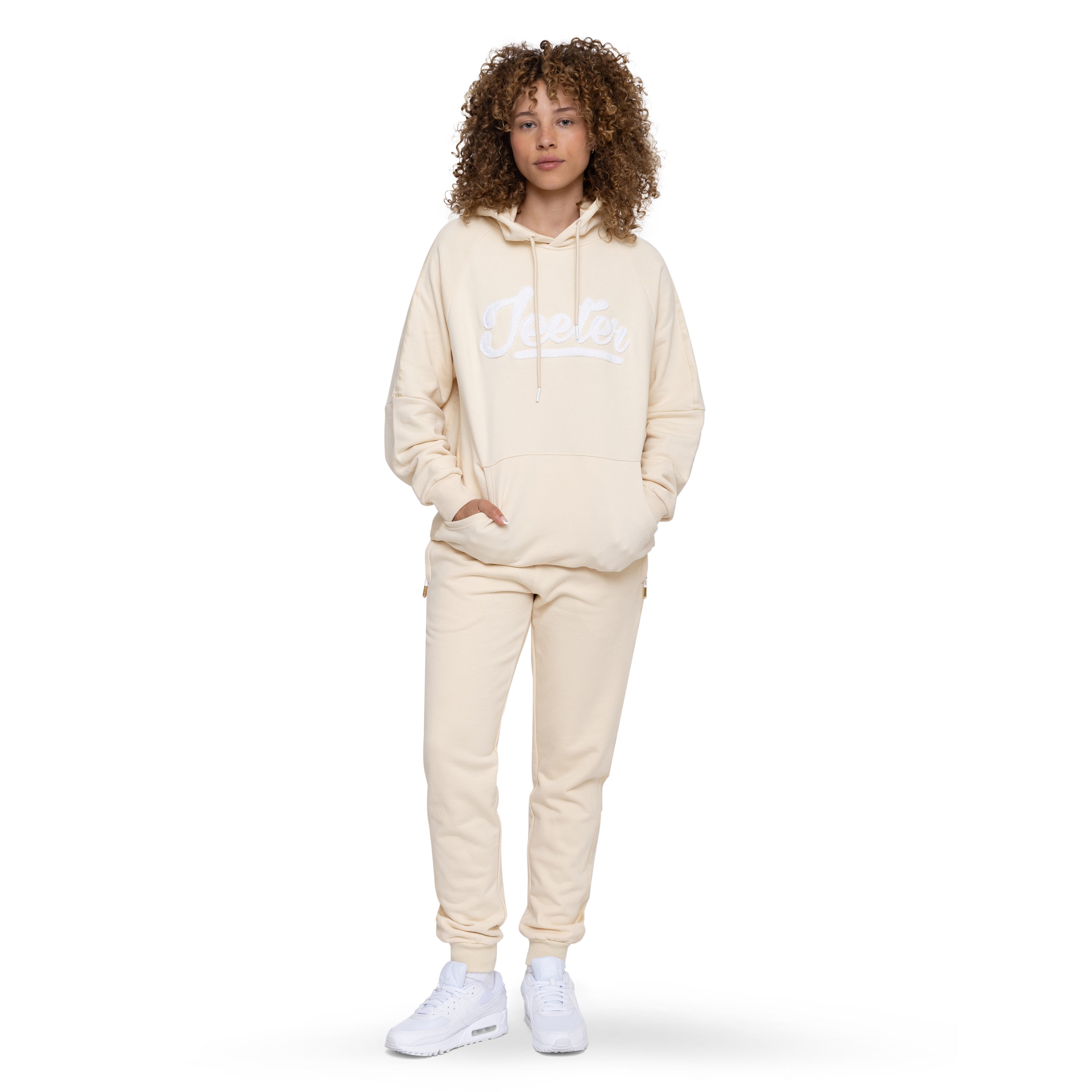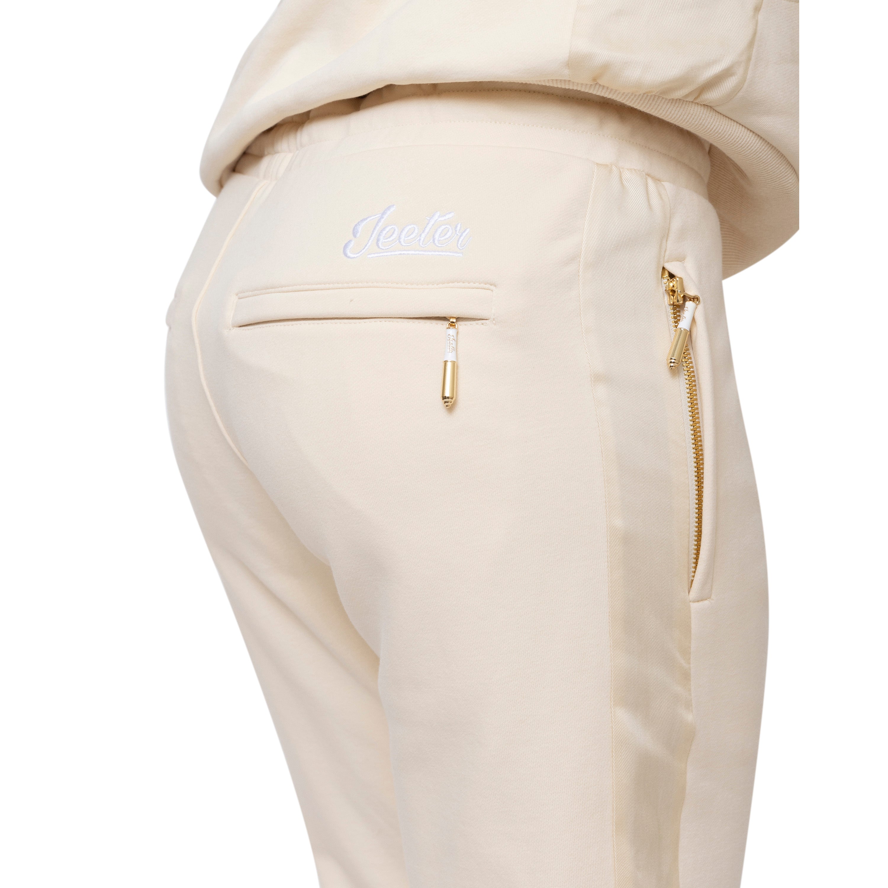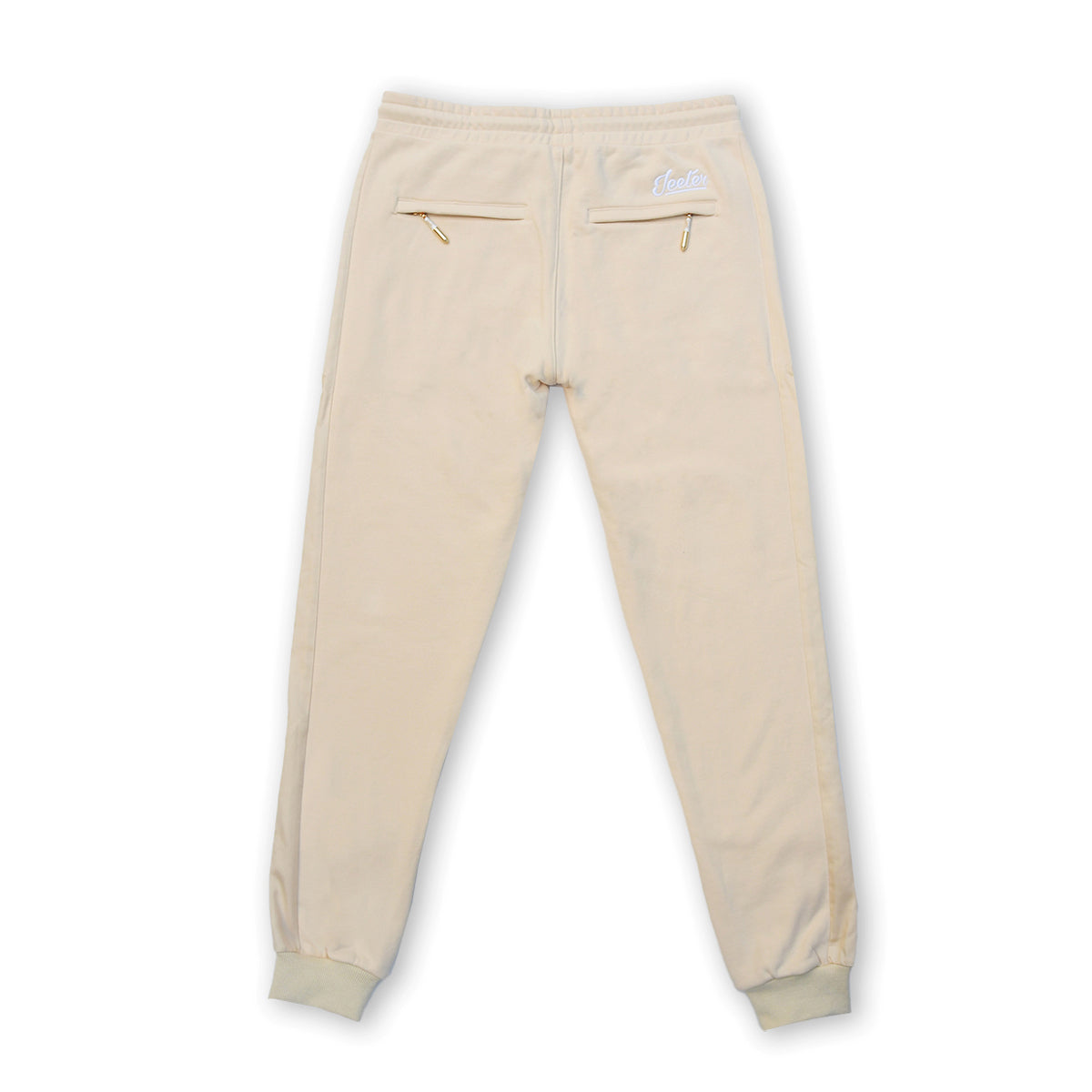 These unisex sweatpants feature our custom “Jeeter hand rolled” zipper pullers with painted enamel and gold finishes, and are made in a tri-season, mid-weight loopback French terry cotton blend. They also feature two zip-pockets at the hip and a rear zip-pocket for secure storage as well as lustrous Tencel contrast trim and provide a slim fit.
