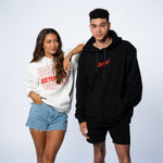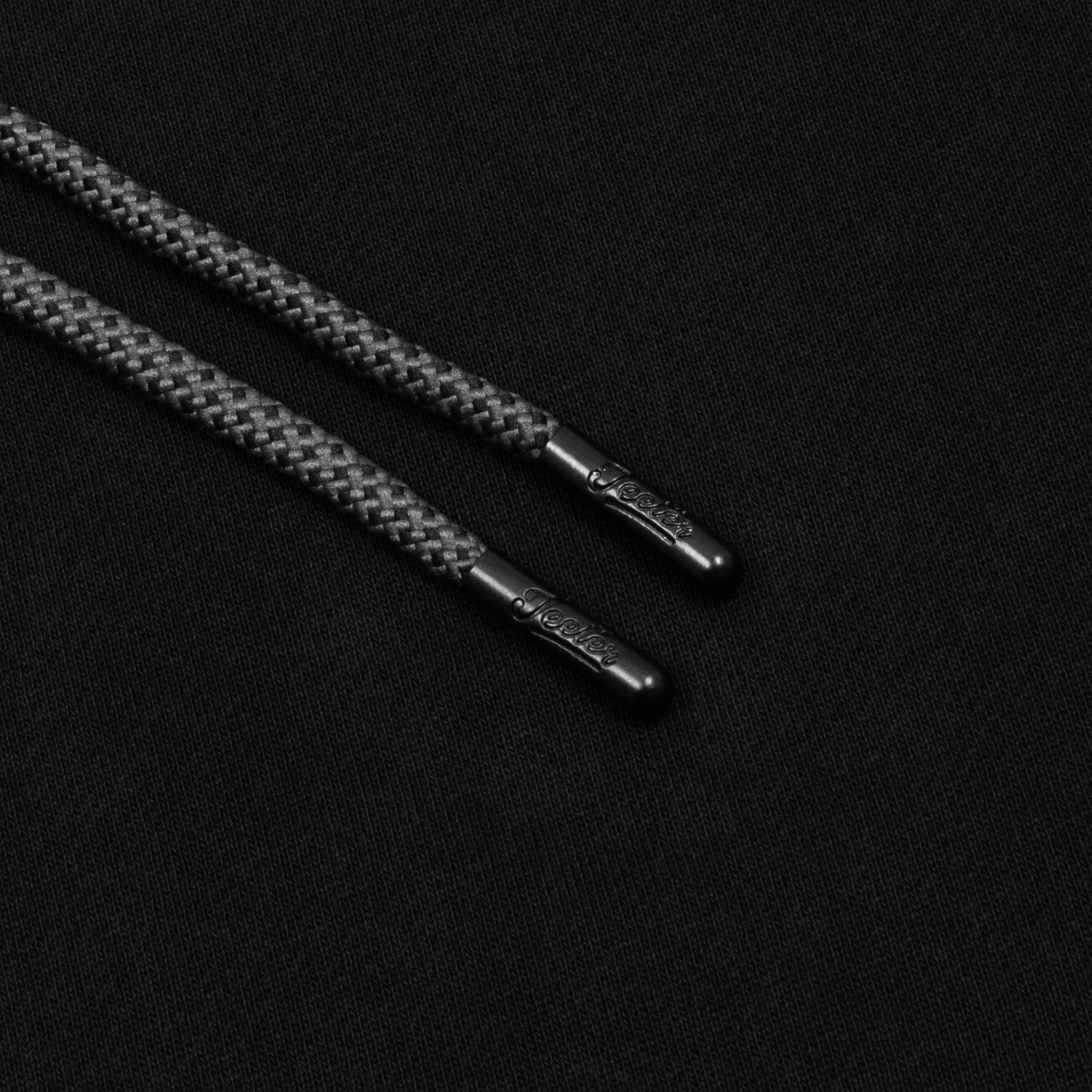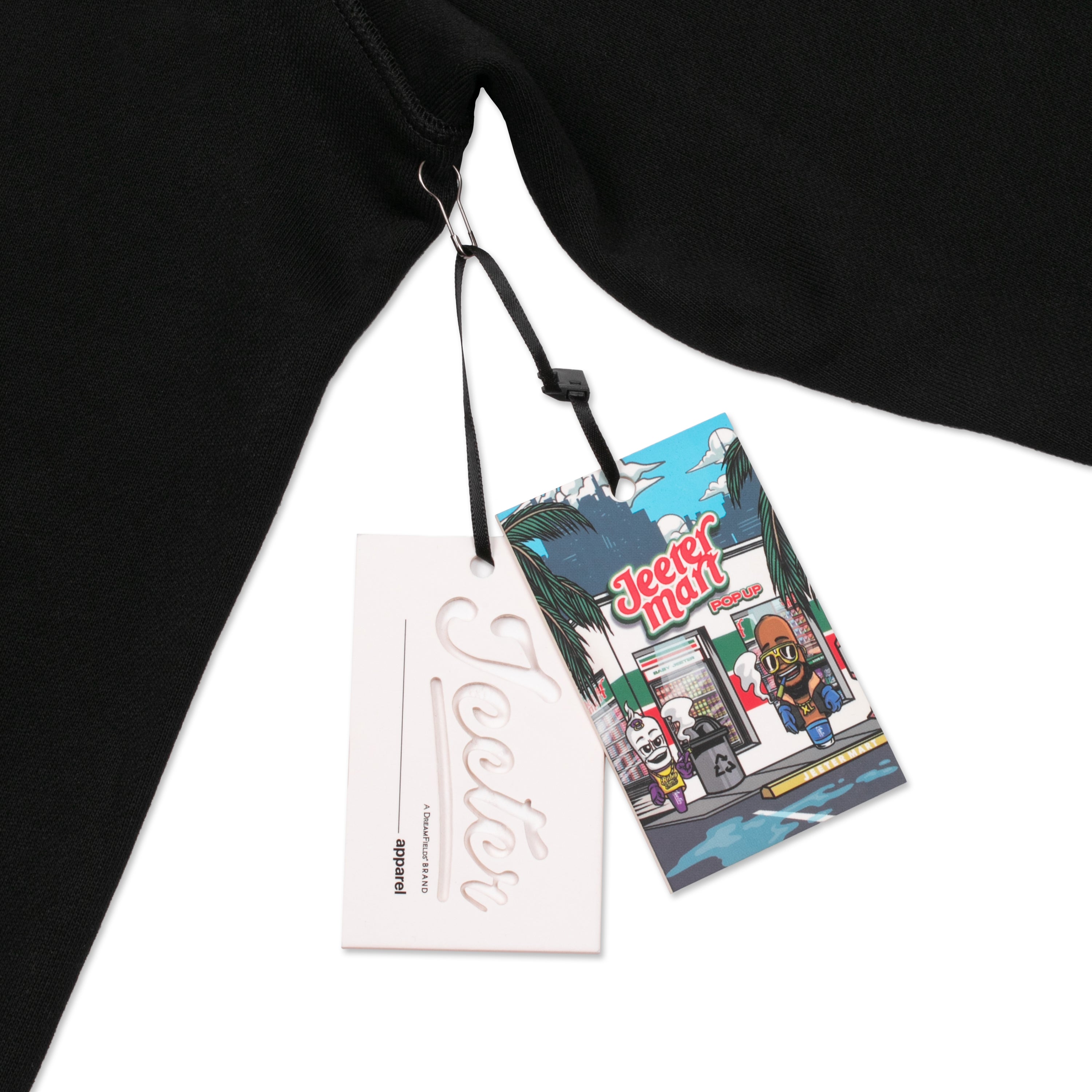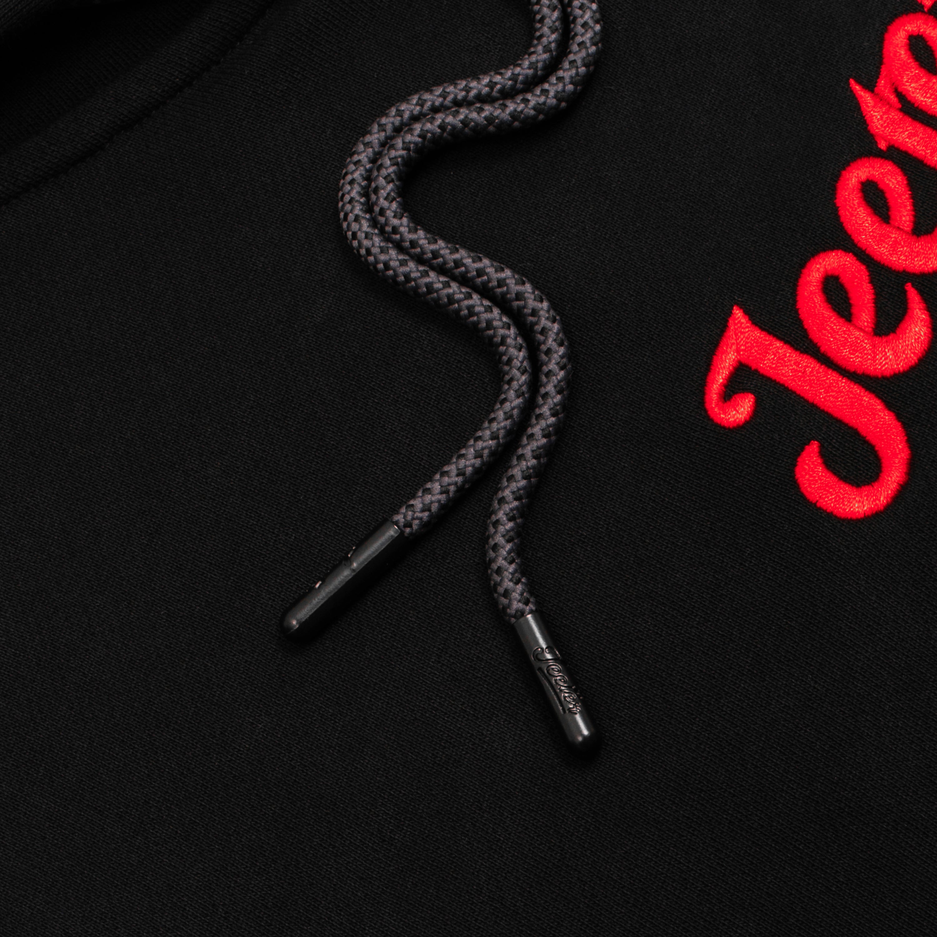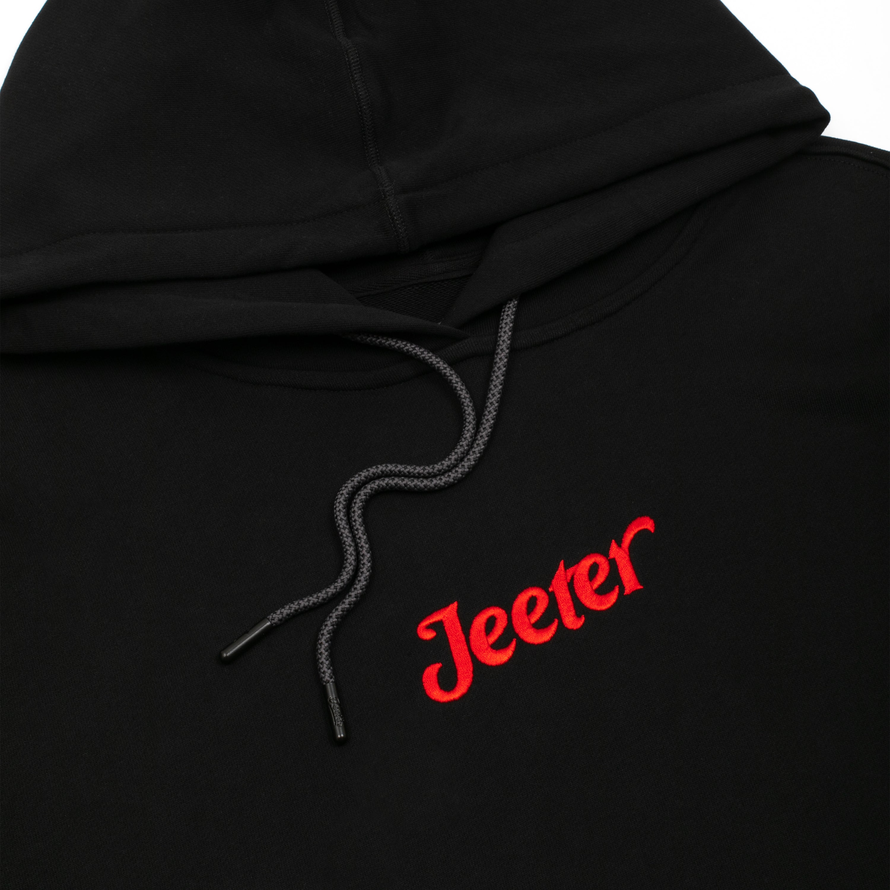 The perfect everyday wears a black hoodie. Made with 100% cotton, this hoodie comes with a drawcord and logo aglets, a kangaroo pocket, and a Jeeter logo embroidered front and center.