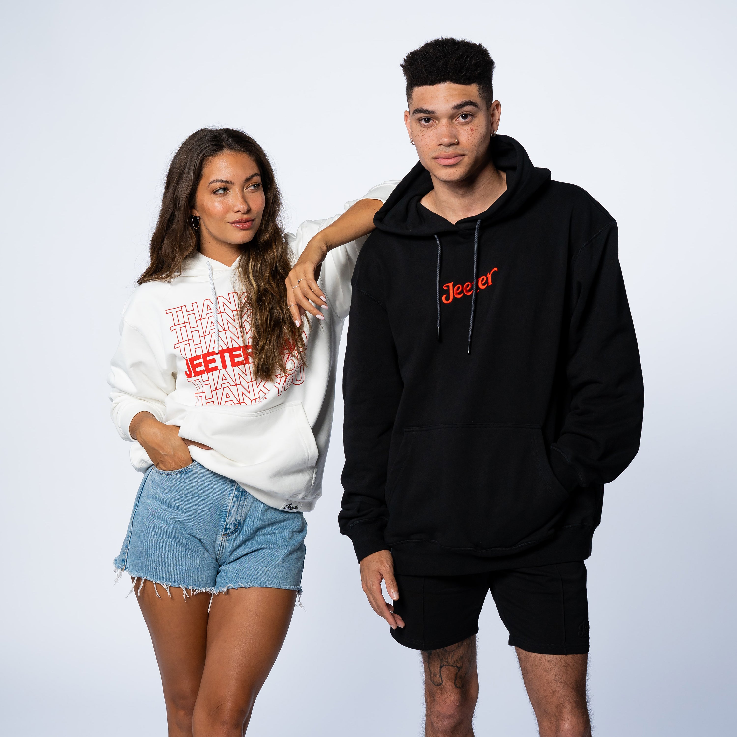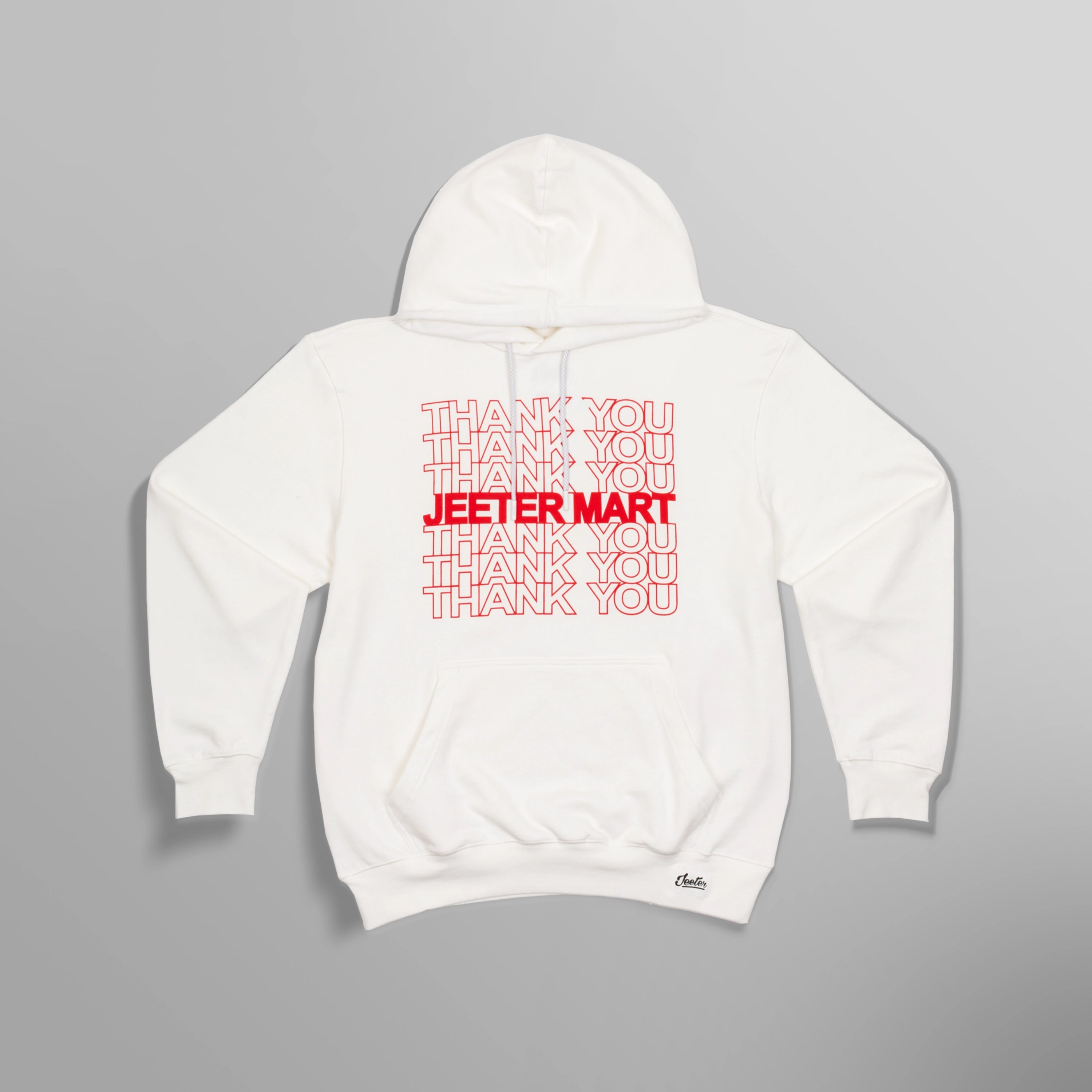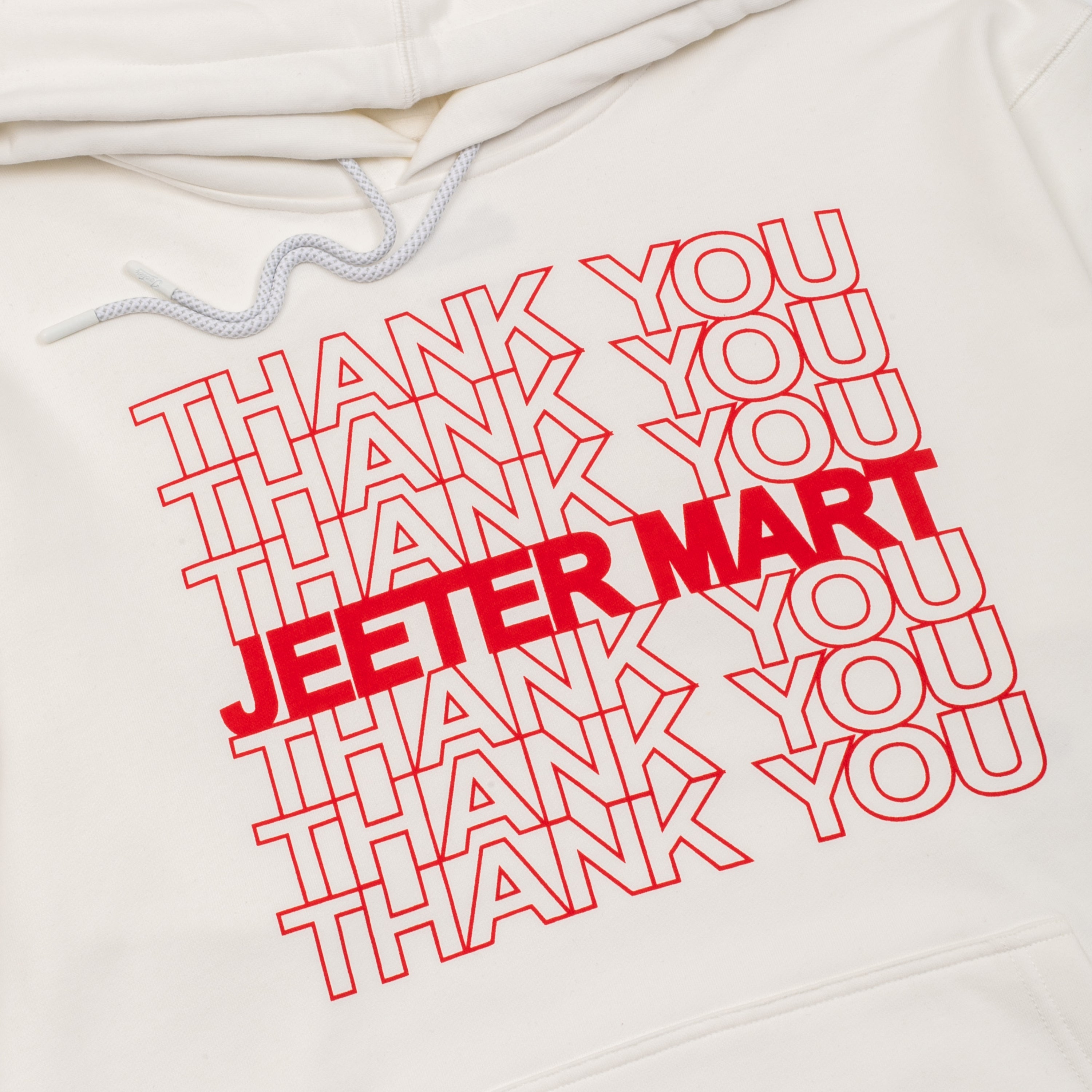 Remember when you’d hit up the corner mart for some munchies and a Slurpee? You’d always wind up leaving with a “Thank You” bag full of your goodies. Now, we’ve given it a Jeeter Mart twist and put that familiar print on an ultra-comfy, 100% cotton hoodie. Features include a drawcord and logo aglet details, a kangaroo pocket, woven logo hem label, and the “Thank You” screen print front and center.