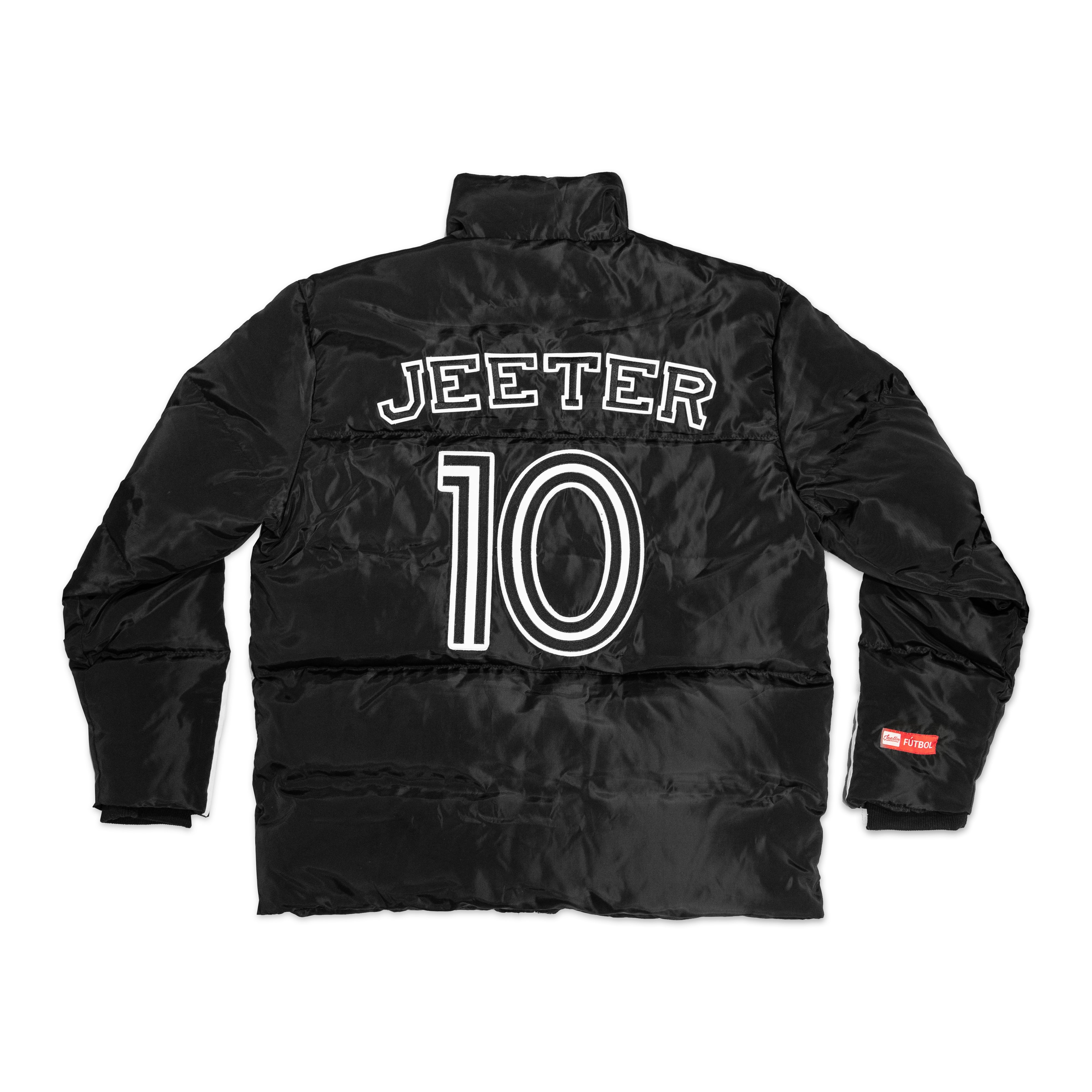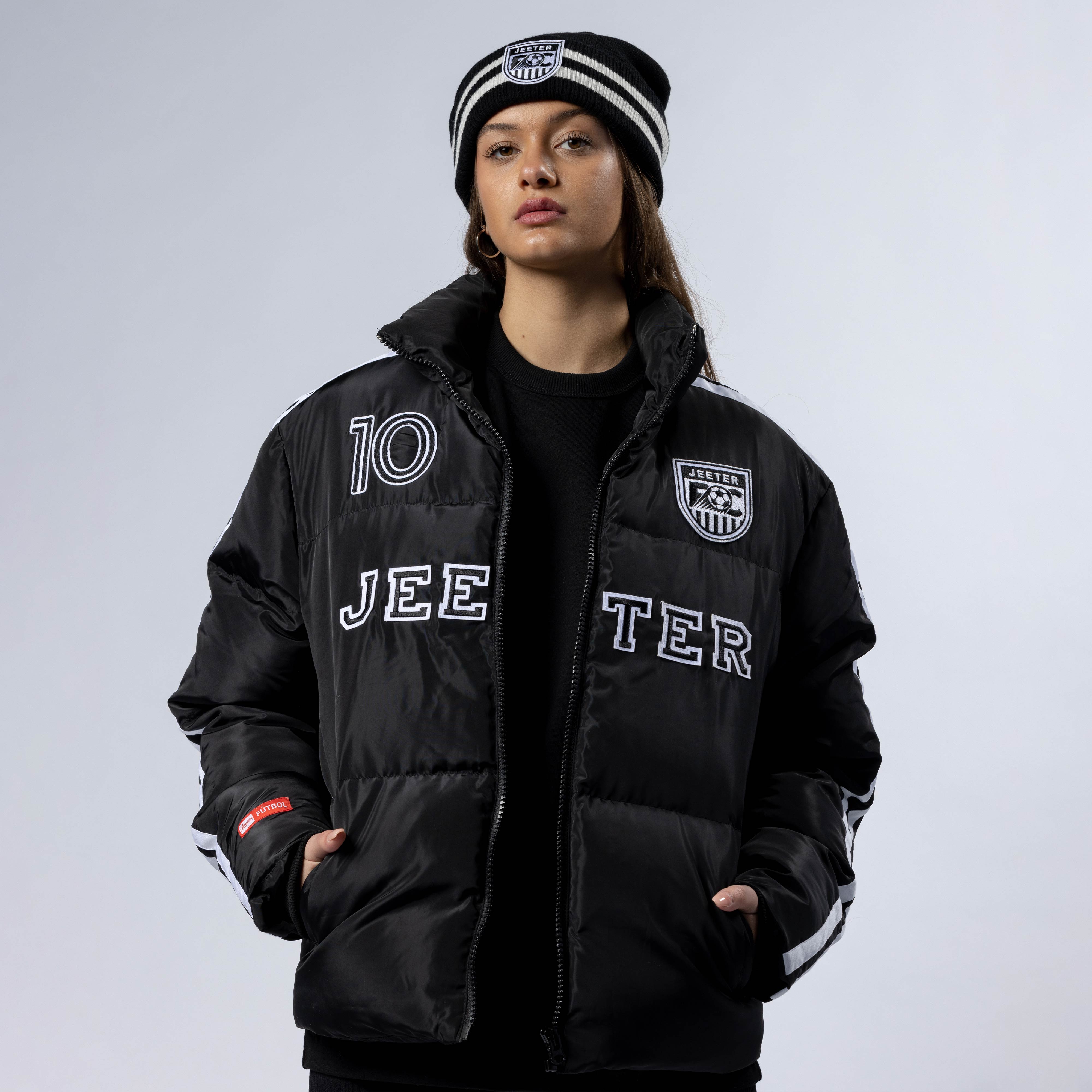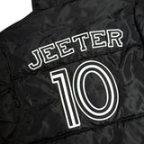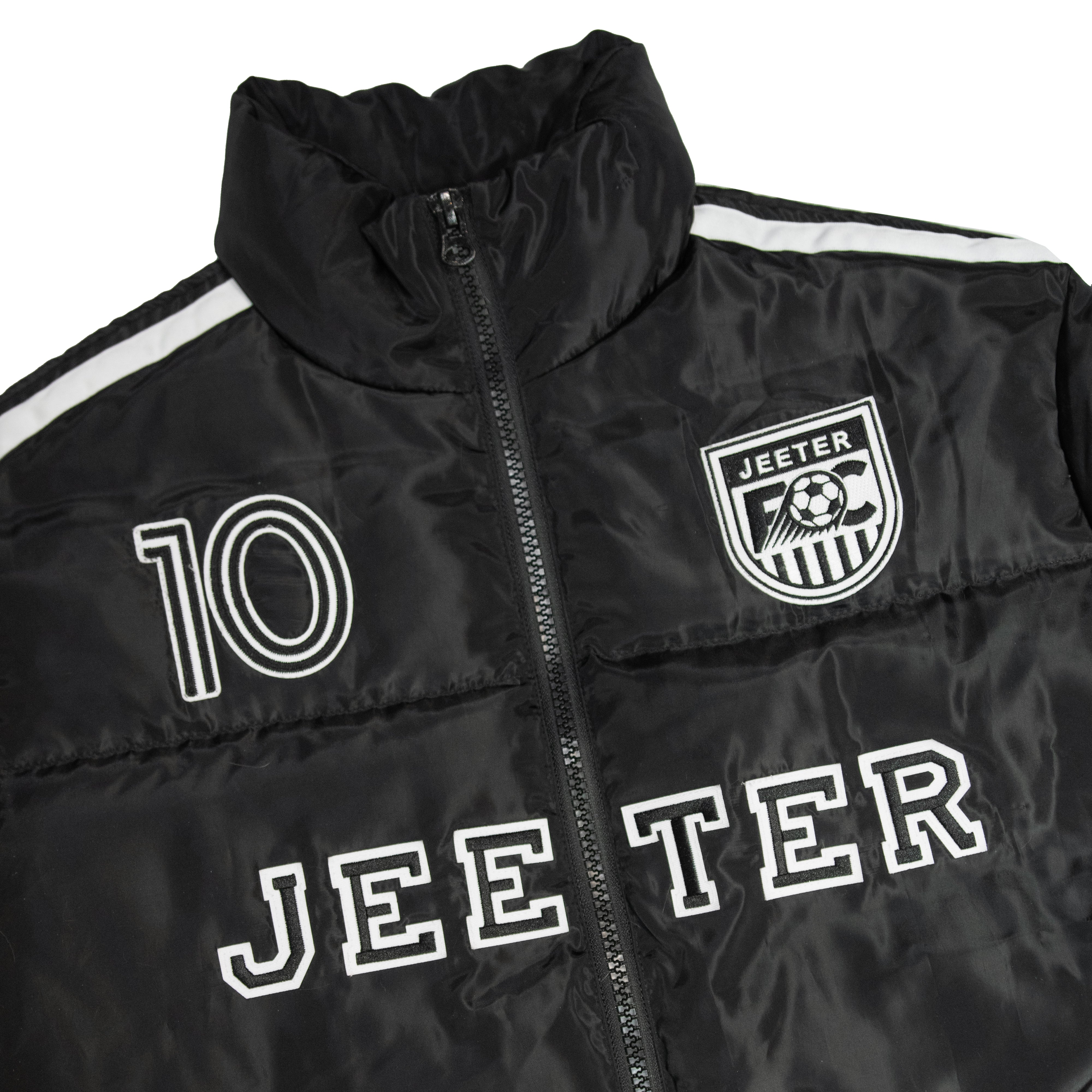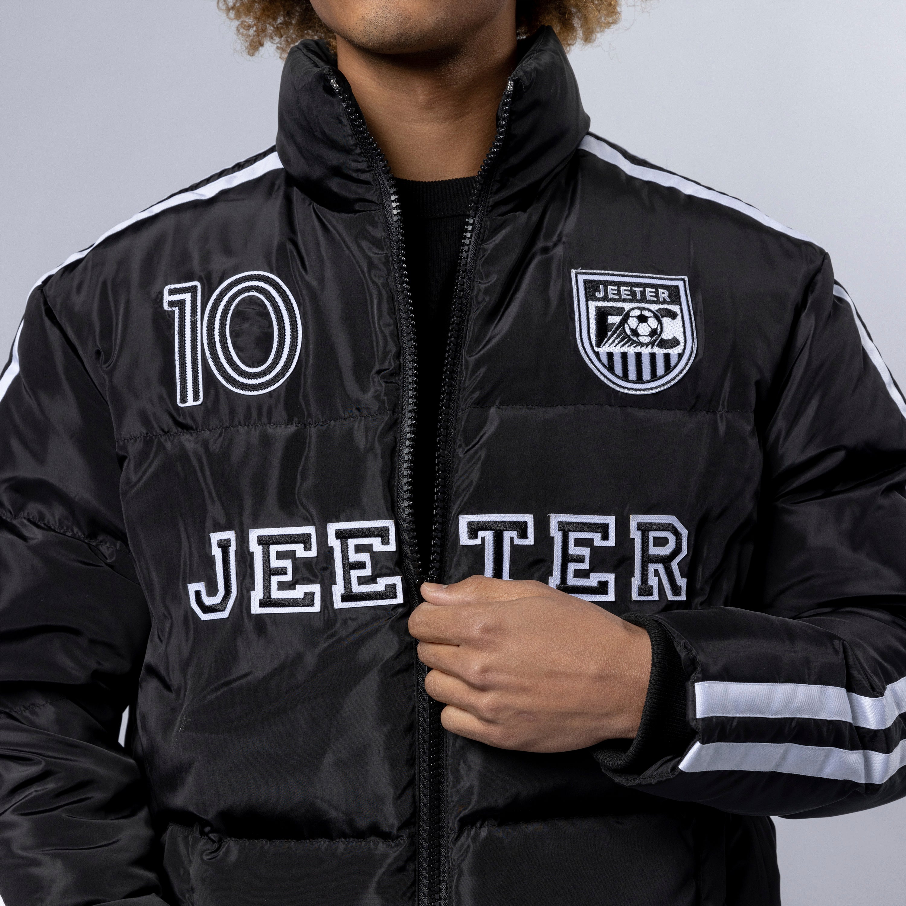 This style features a 800 down-fill for supreme warmth insulation from the elements. It has regimental stripes at the sleeves, mock neck construction, center front zipper closure with Jeeter logo zipper pullers and hidden ribbed sleeve cuffs. The puffer features Jeeter FC crest patch, captain’s #10 patch and Jeeter logo sponsor and team patches at the center front and rear panels.