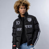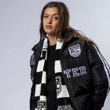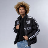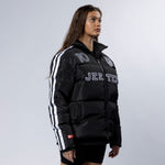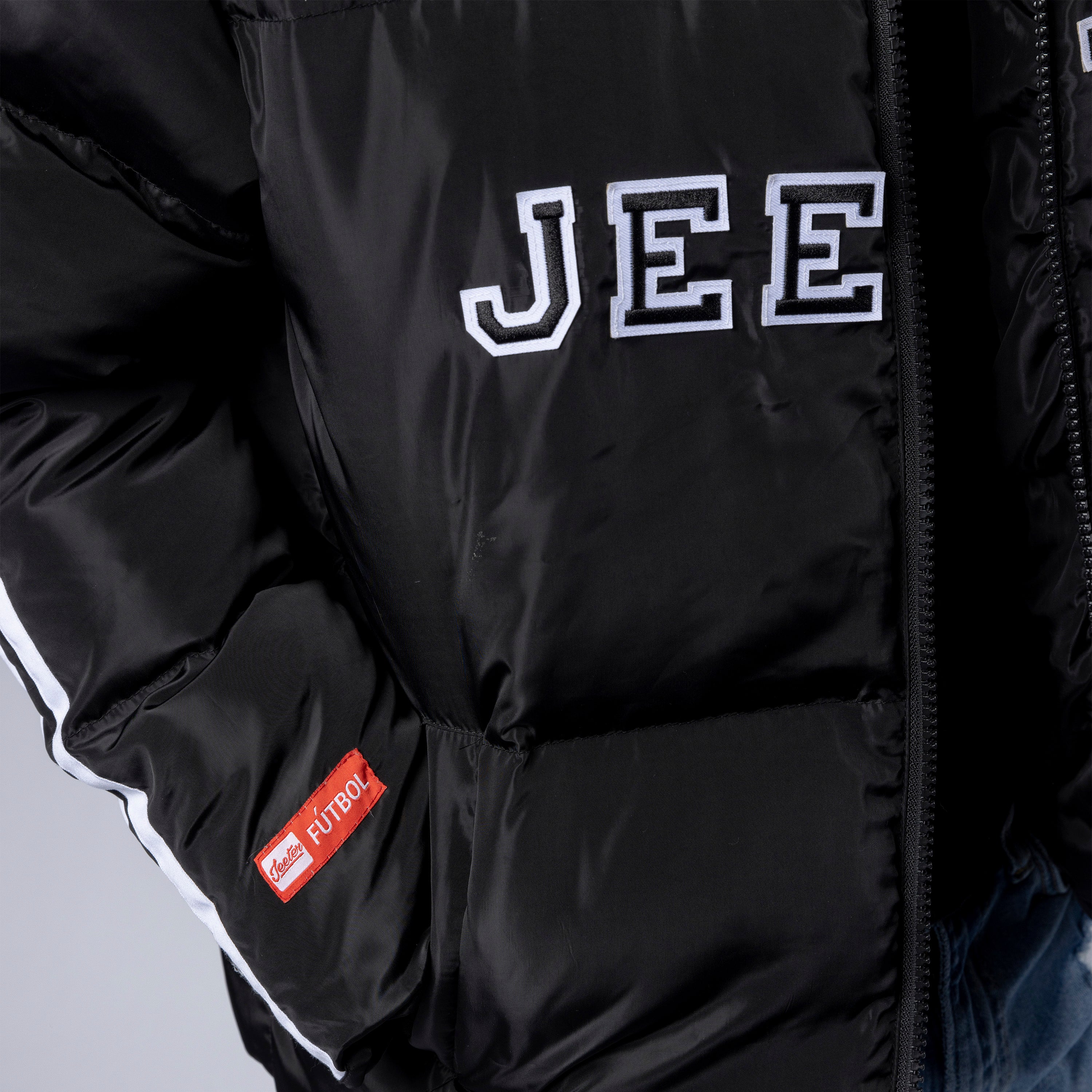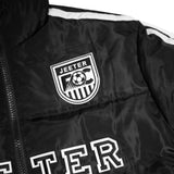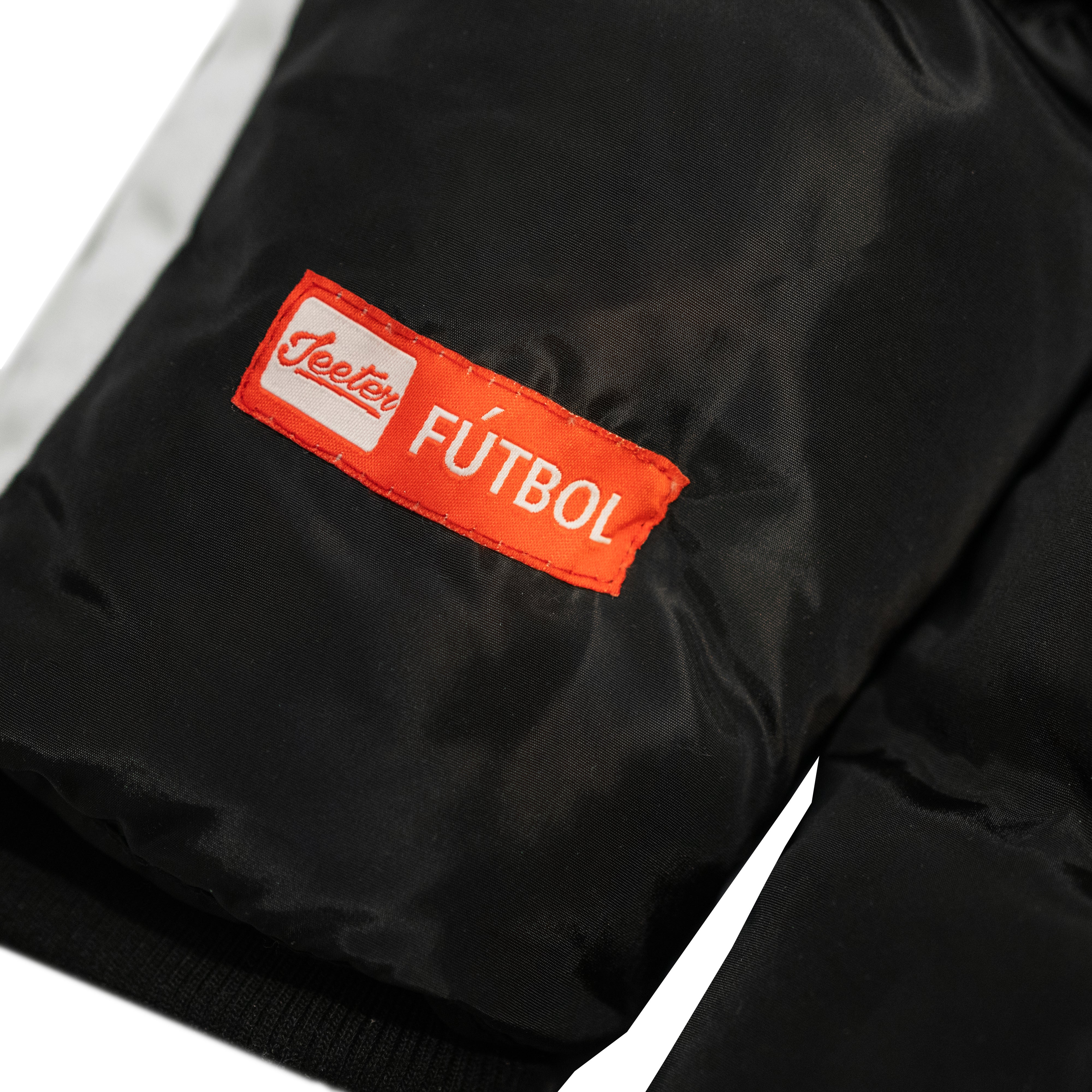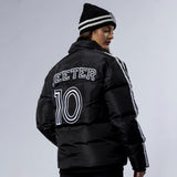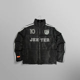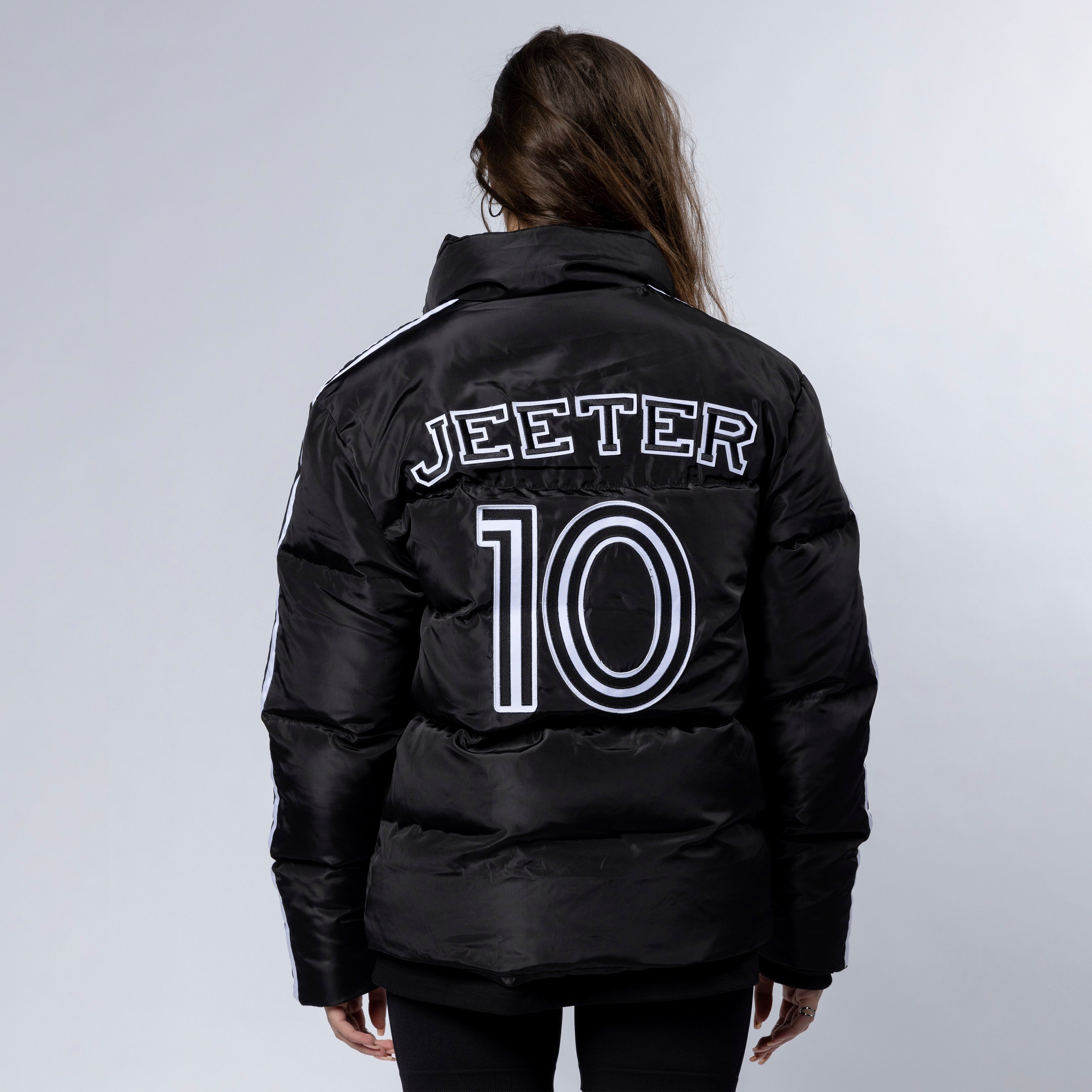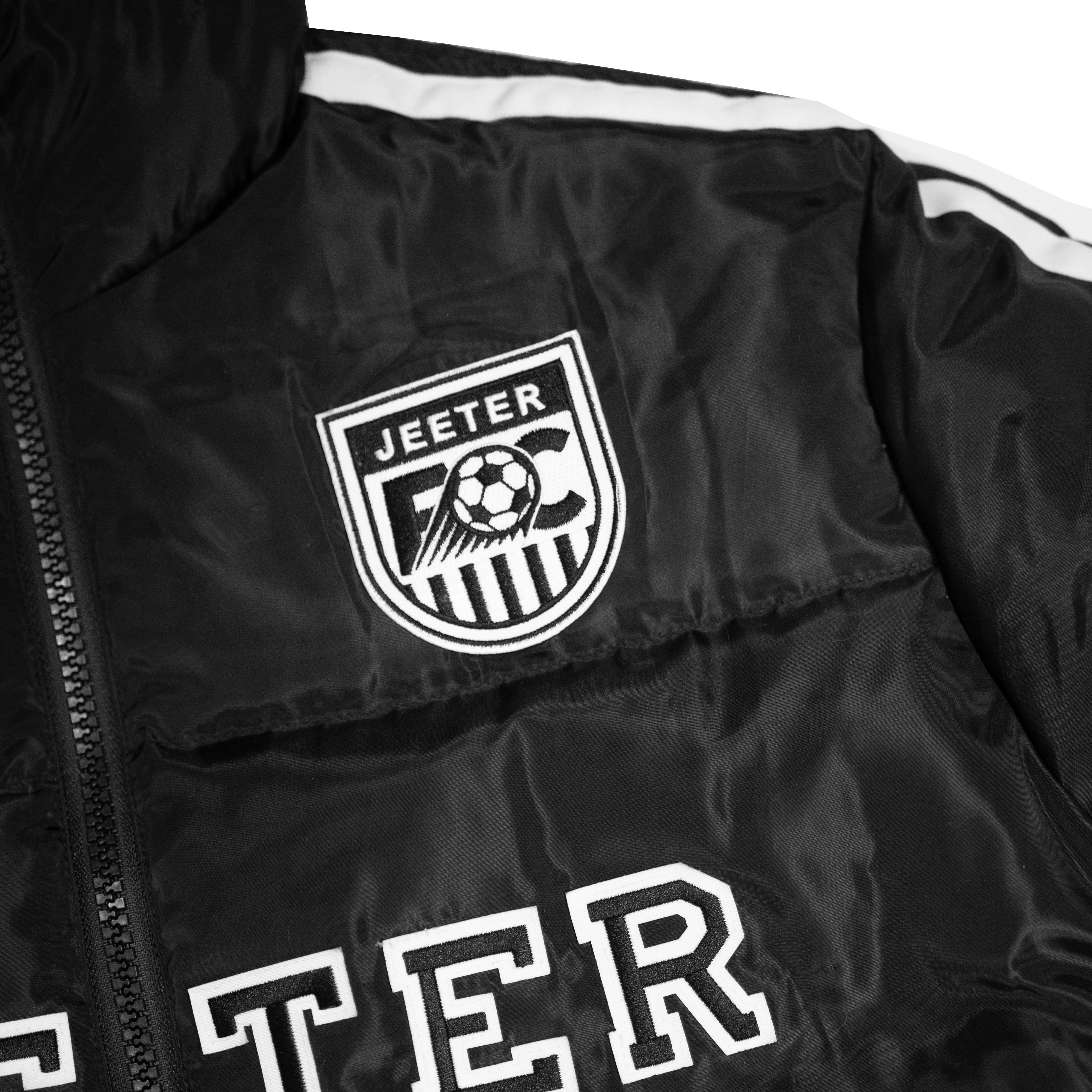 This style features a 800 down-fill for supreme warmth insulation from the elements. It has regimental stripes at the sleeves, mock neck construction, center front zipper closure with Jeeter logo zipper pullers and hidden ribbed sleeve cuffs. The puffer features Jeeter FC crest patch, captain’s #10 patch and Jeeter logo sponsor and team patches at the center front and rear panels.