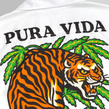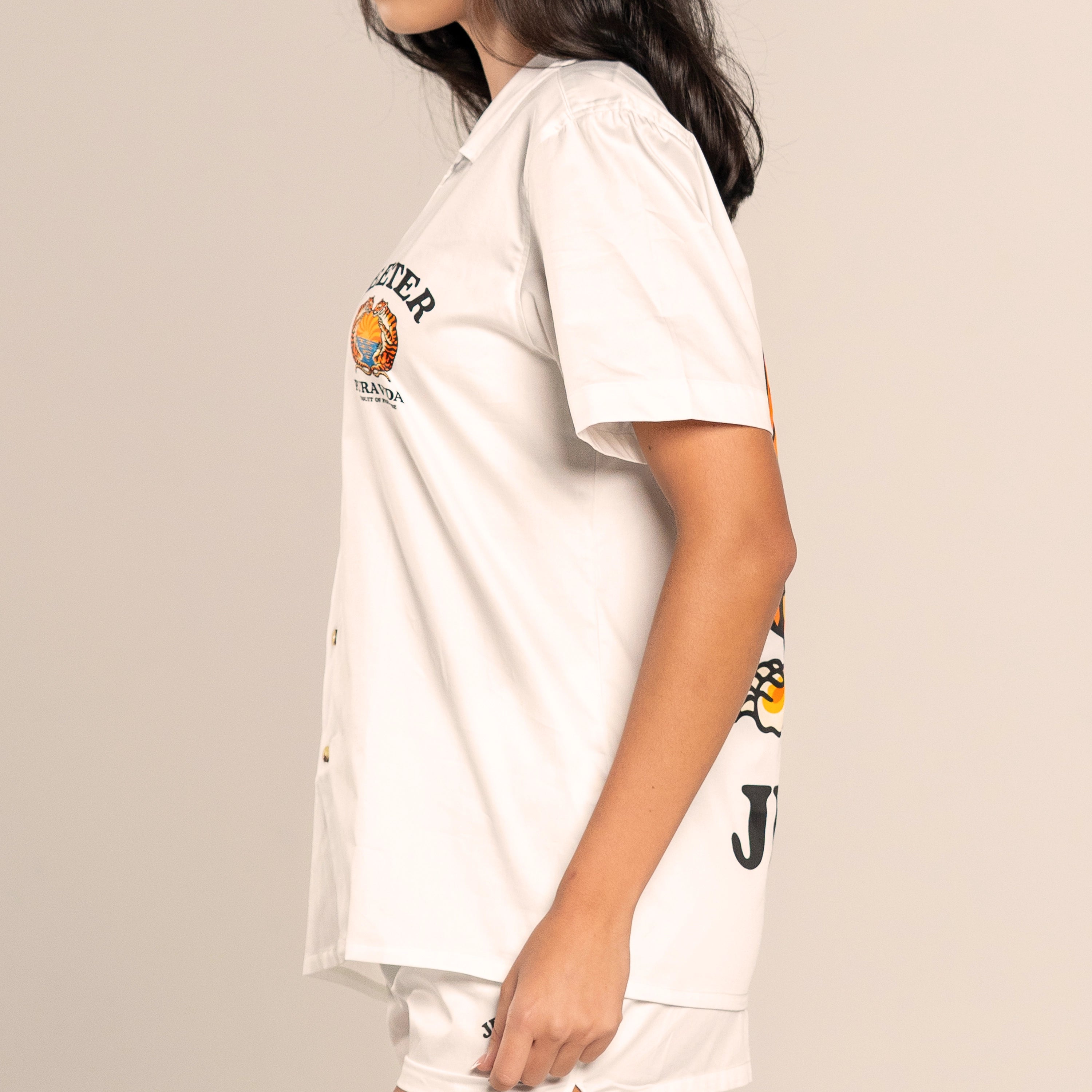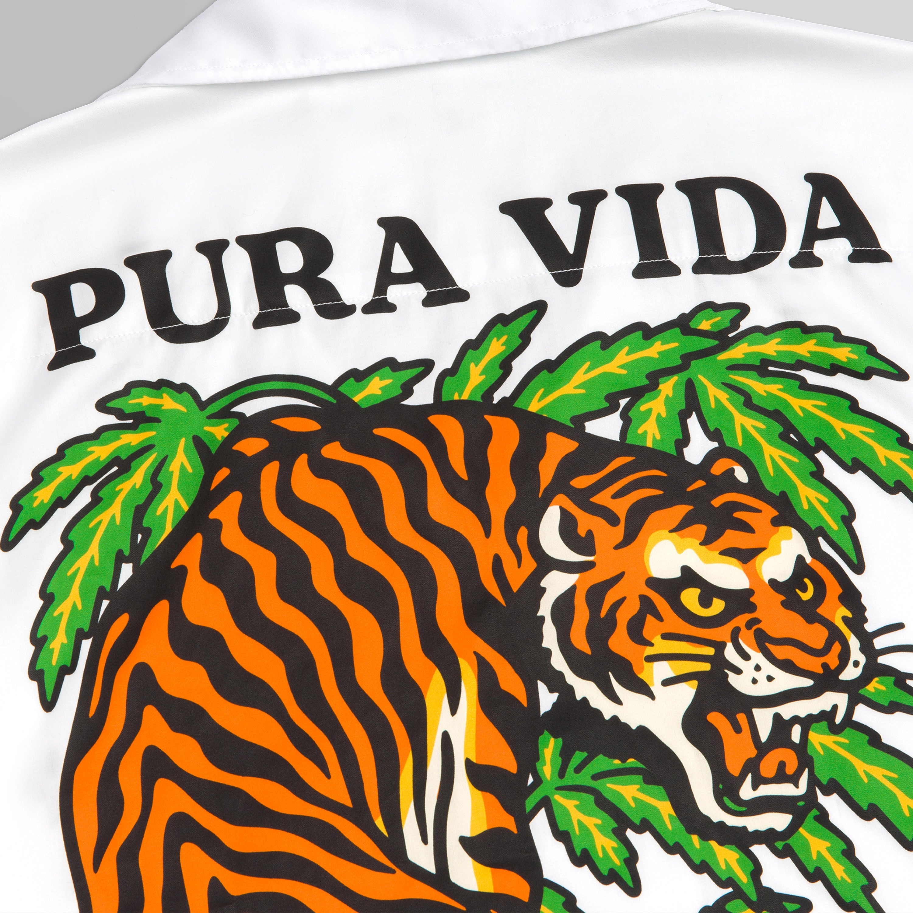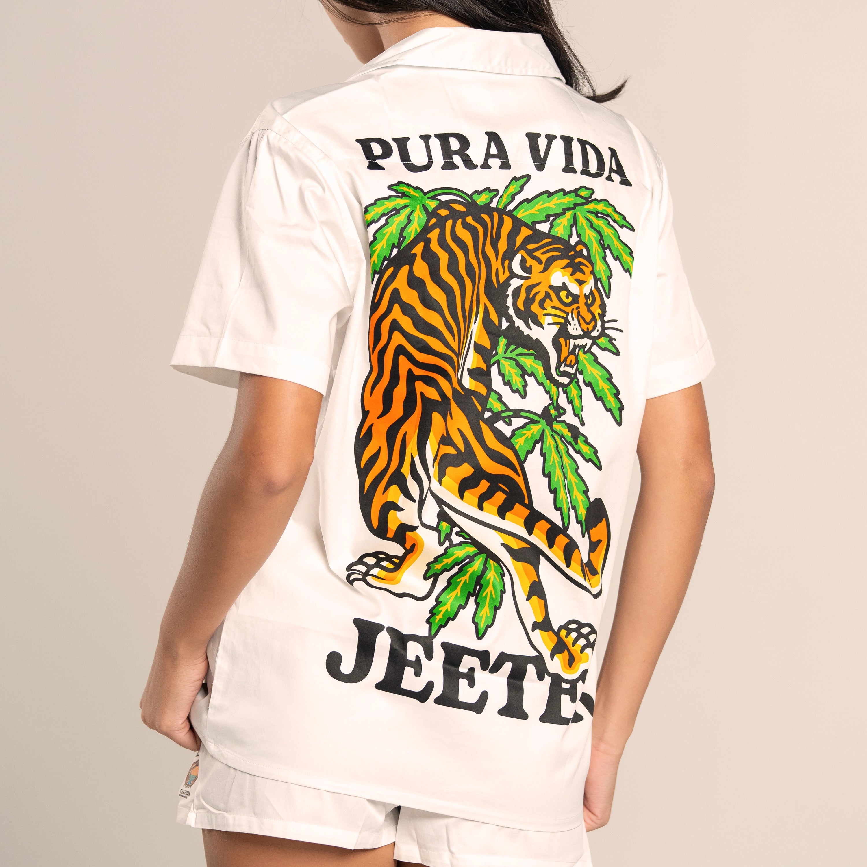 Smooth, lightweight, and built to move — this matte satin button down is the definition of effortless heat. Designed with a relaxed unisex fit, it brings breezy comfort with a polished edge, whether you’re chasing golden hour or stepping out after dark. Finished with a bold back graphic that roars with jungle energy, it’s made to stand out from every angle. Pair it with the matching shorts for the full Pura Vida vibe.