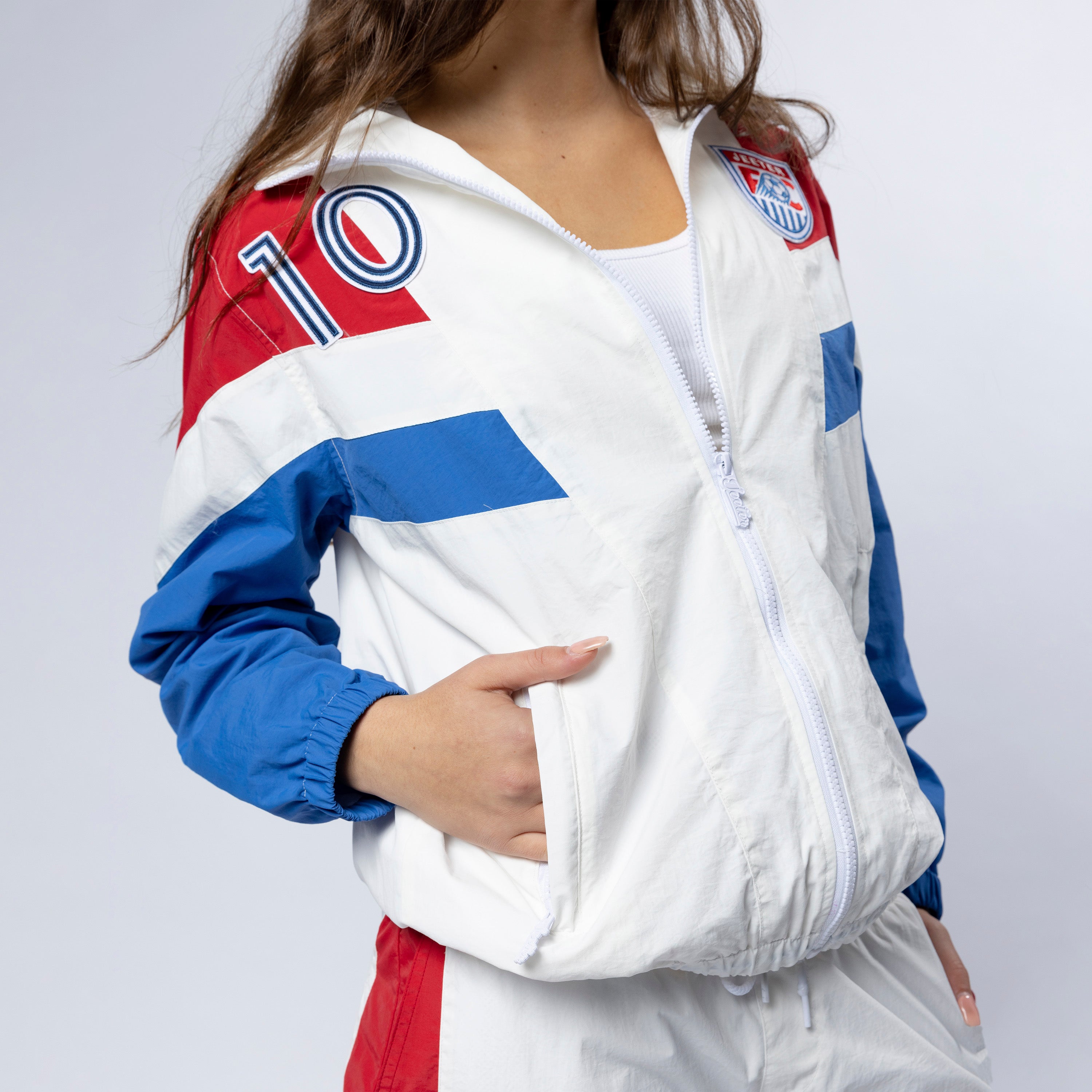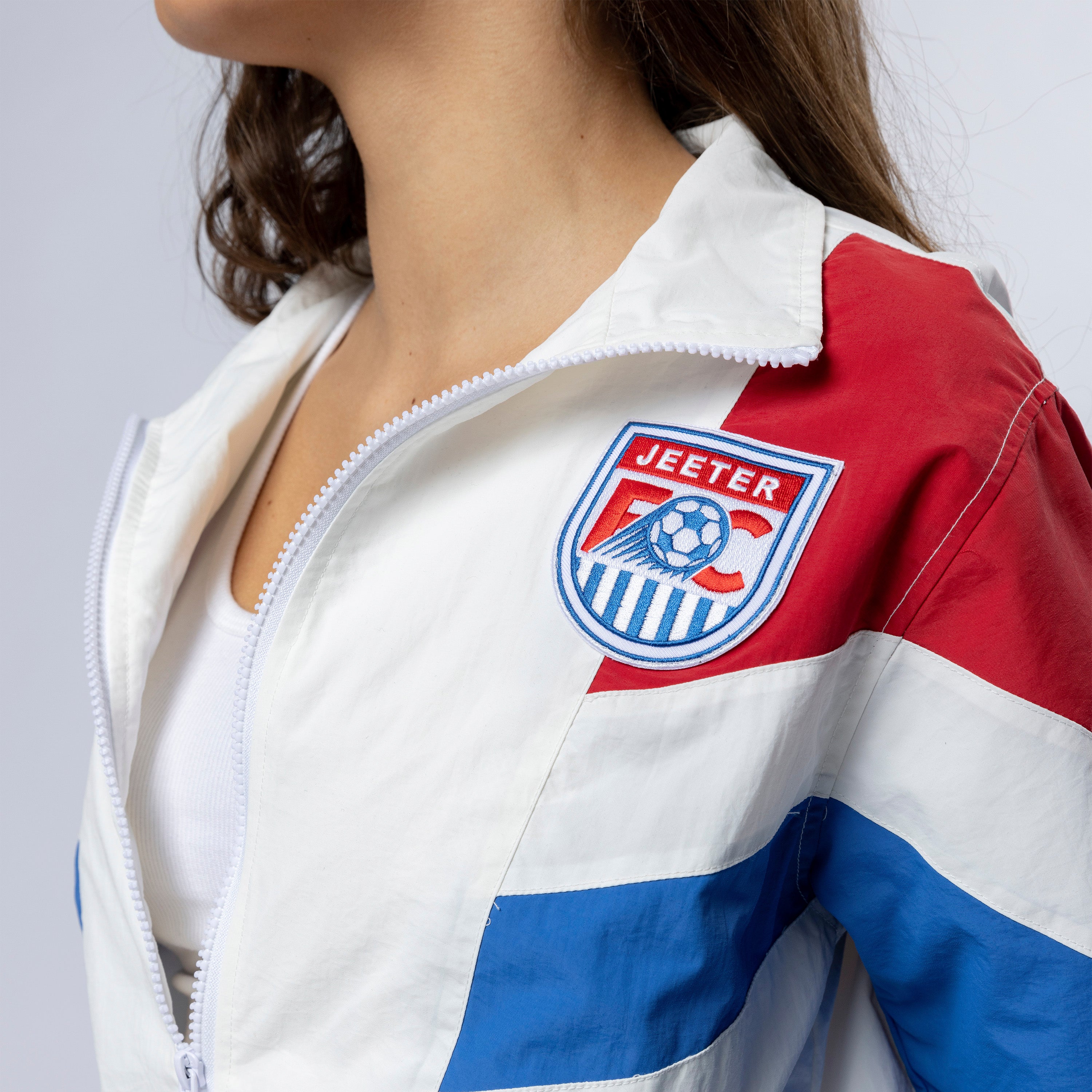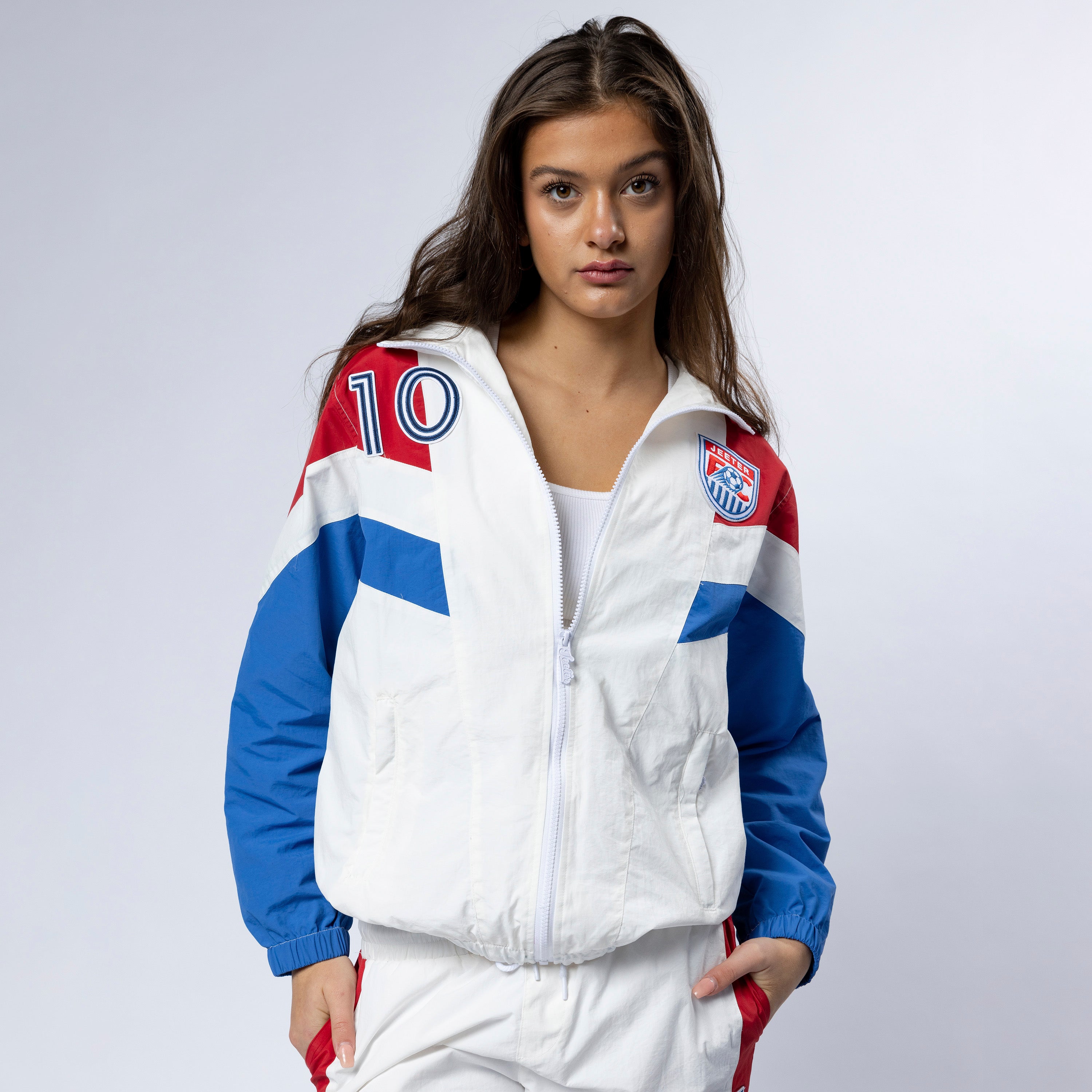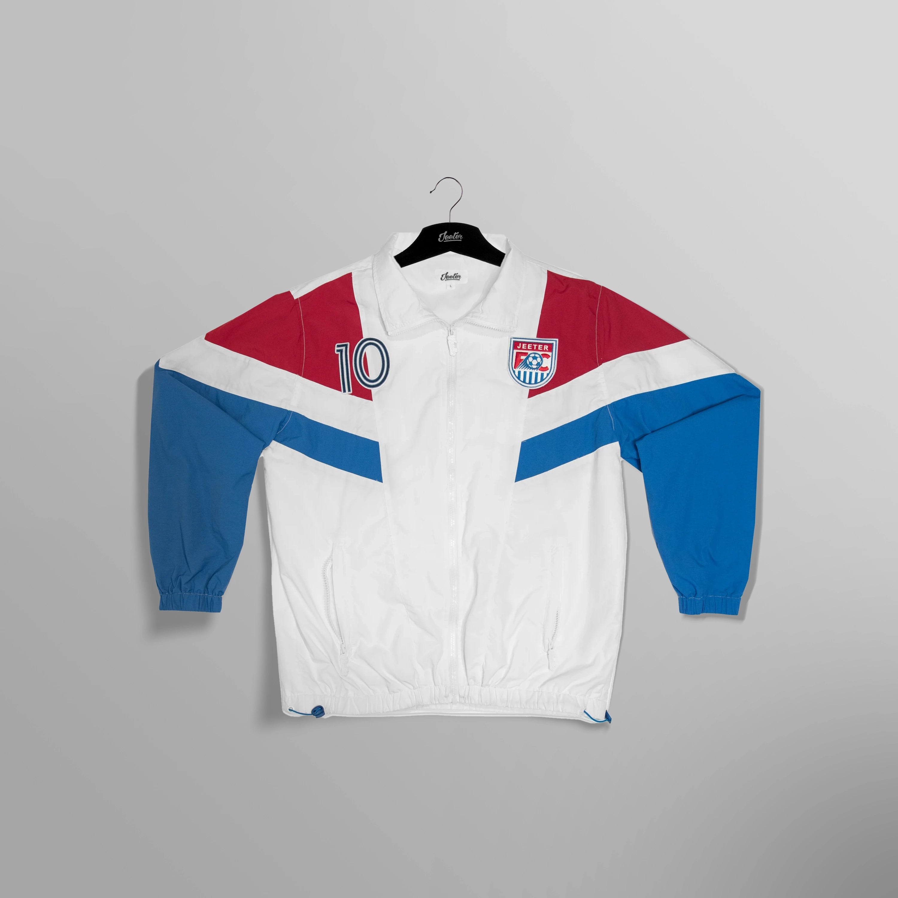 100% nylon with moisture wicking properties, this style is fully lined to stay warmer in cold temperatures. It features chevron piecing construction at the chest, sleeve and rear panels. This style is adorned with the Jeeter FC crest patch and captain’s #10 patch.