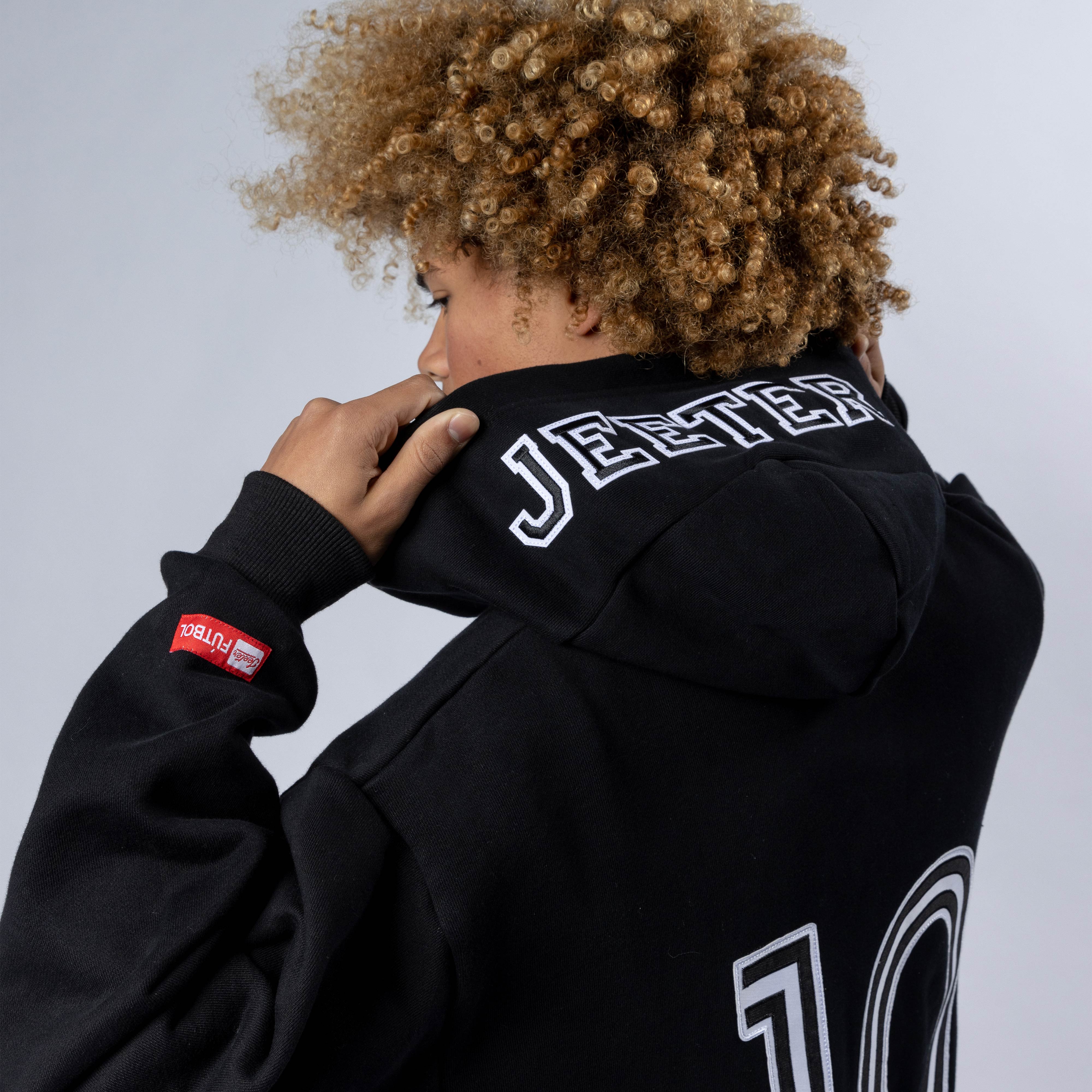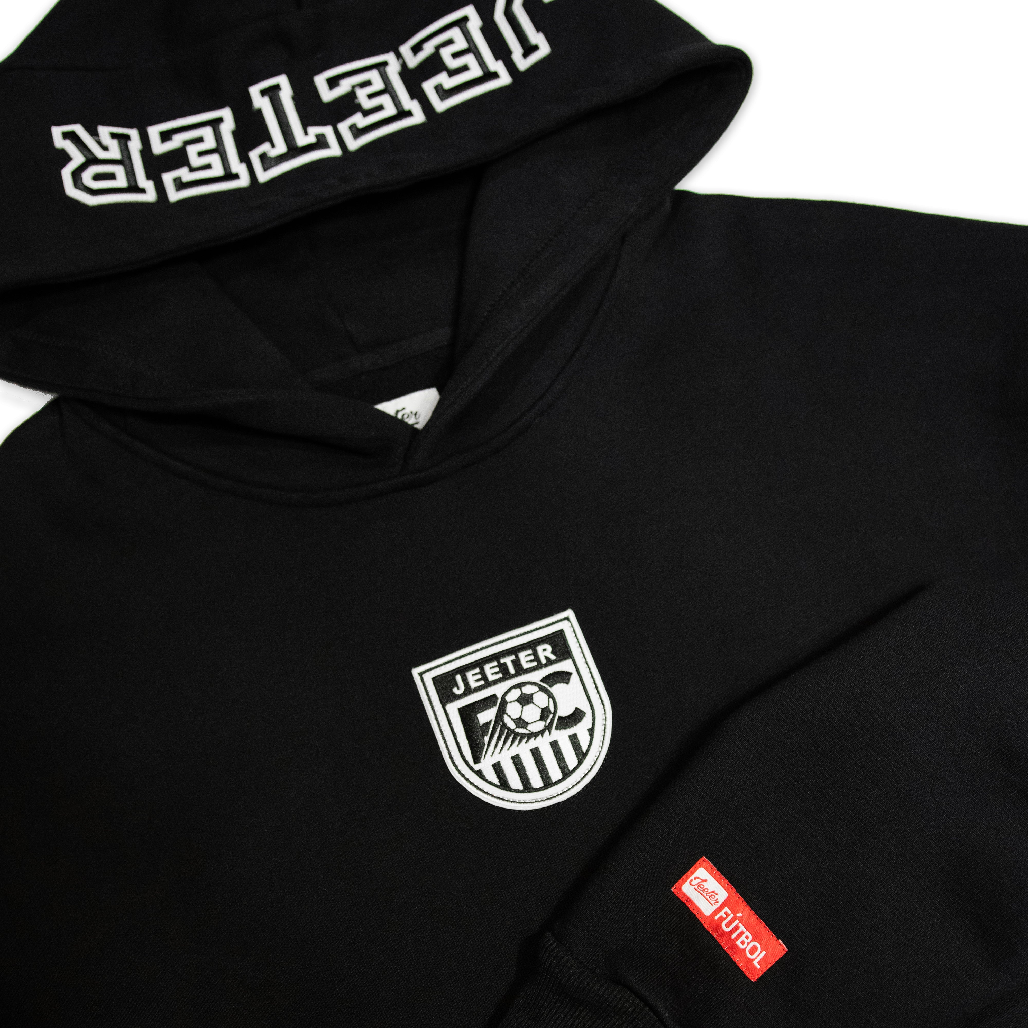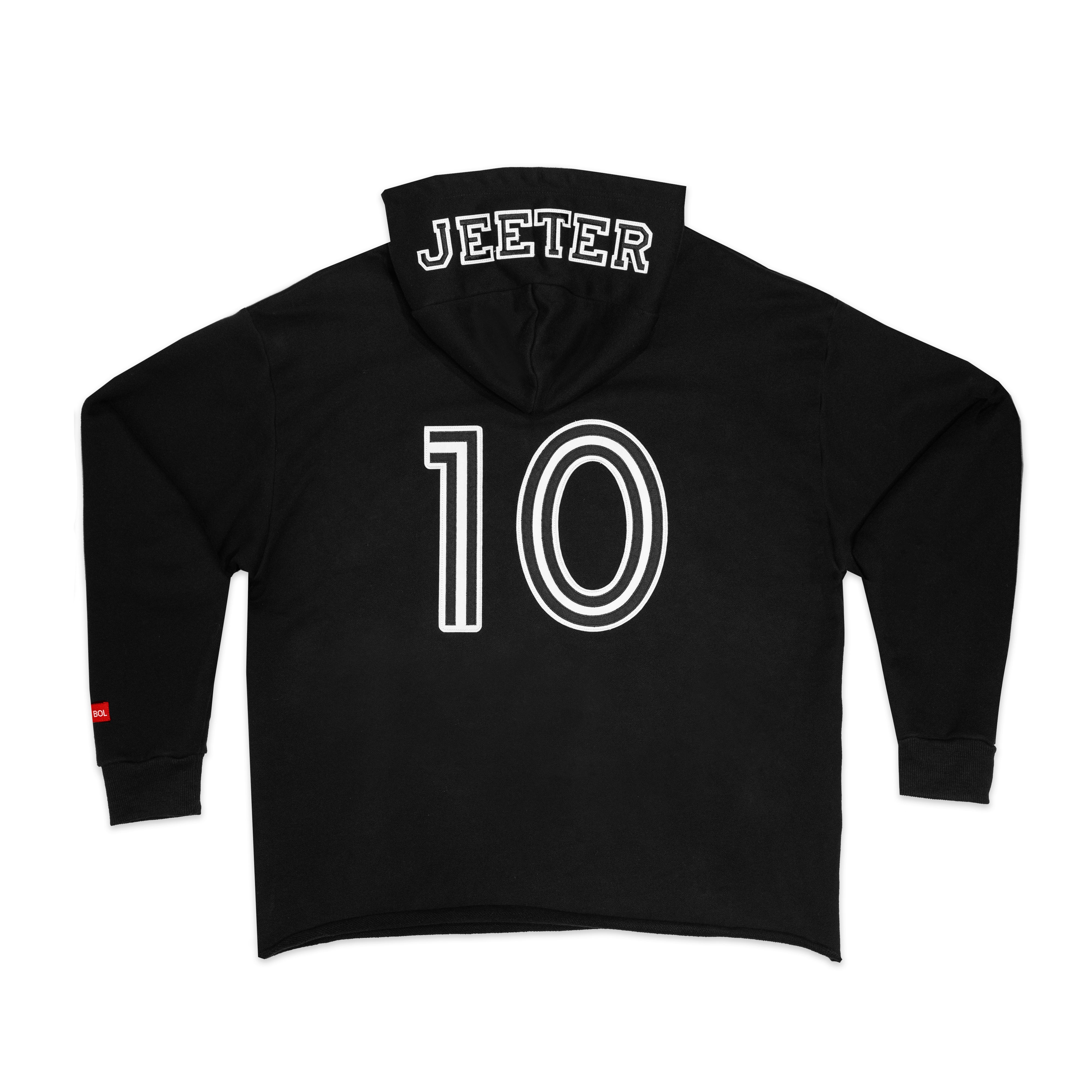 Heavier weight hoodie with 3 piece hood construction featuring game logo applique on the hood, small Jeeter FC crest patch at center front, hidden #10 patch with kangaroo pocket and raw edge hem.
