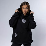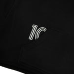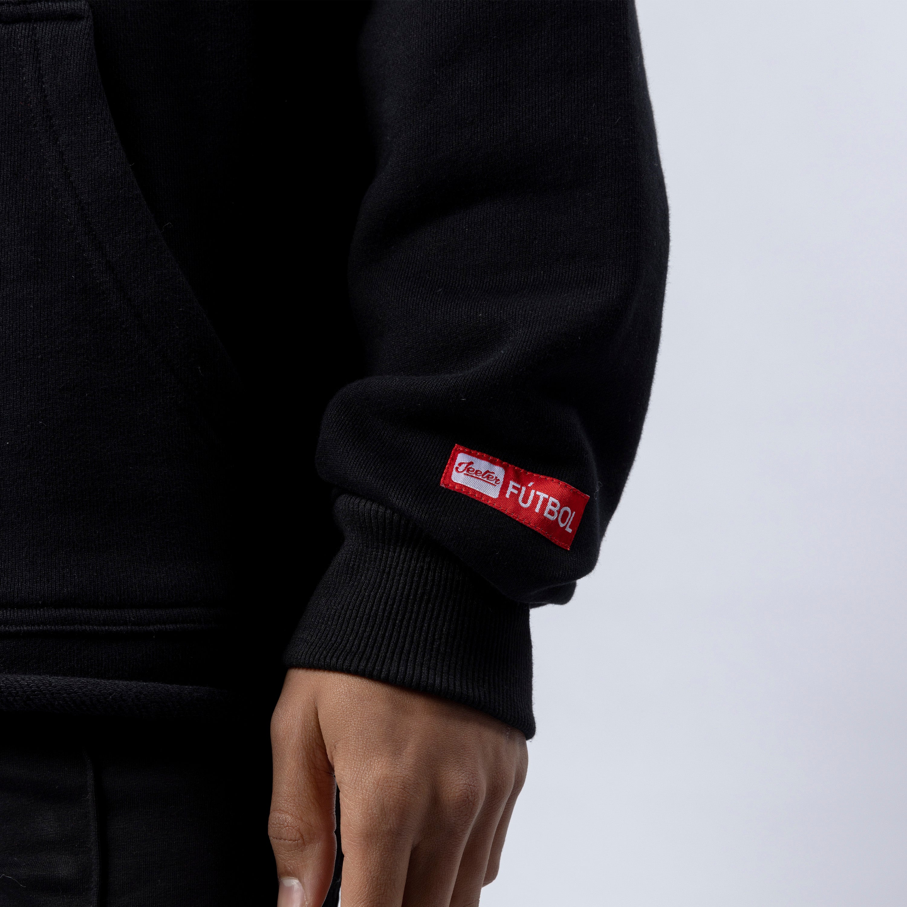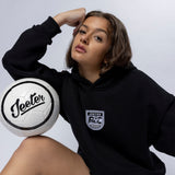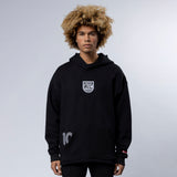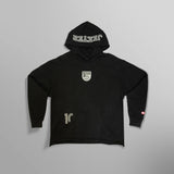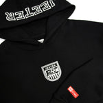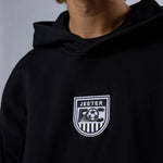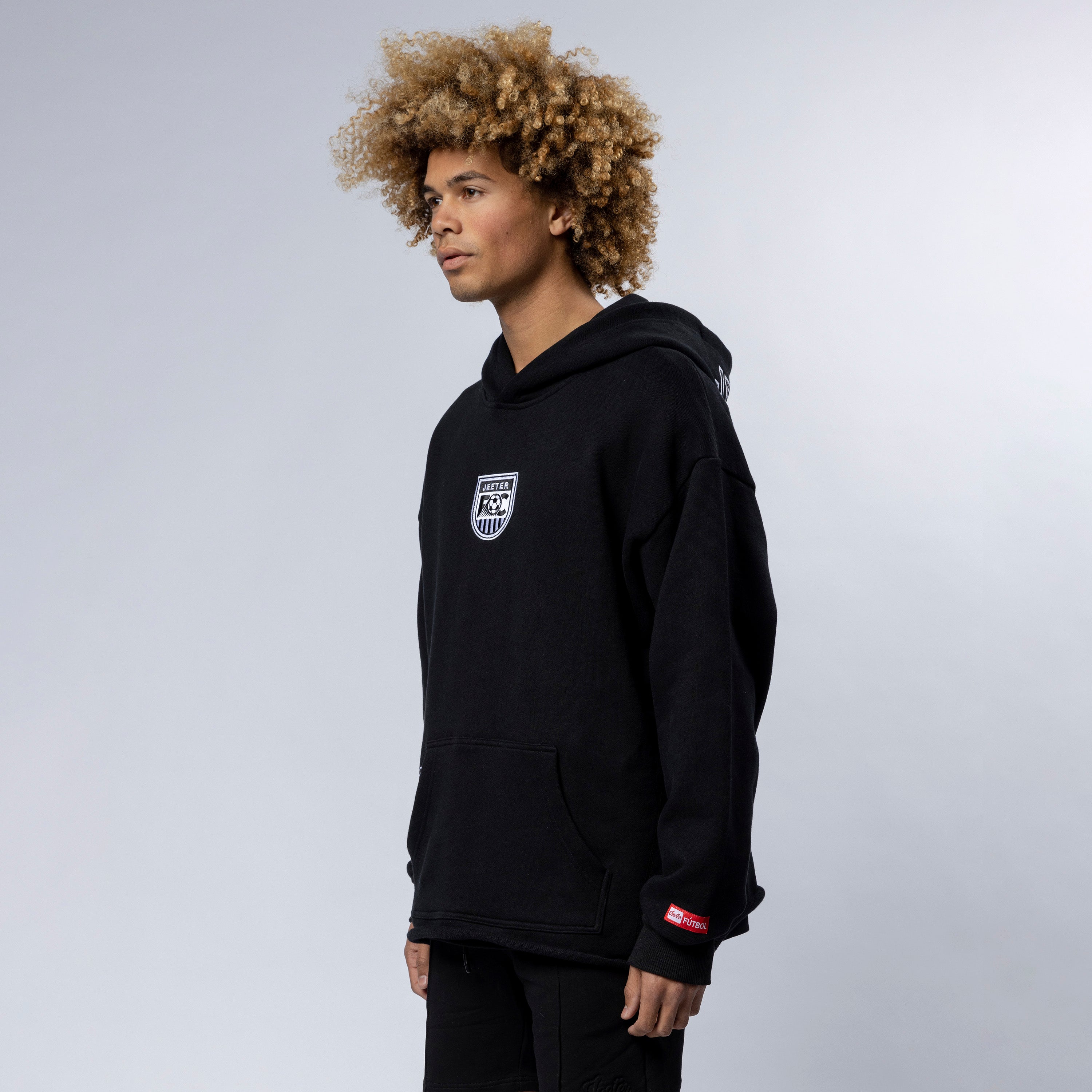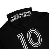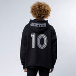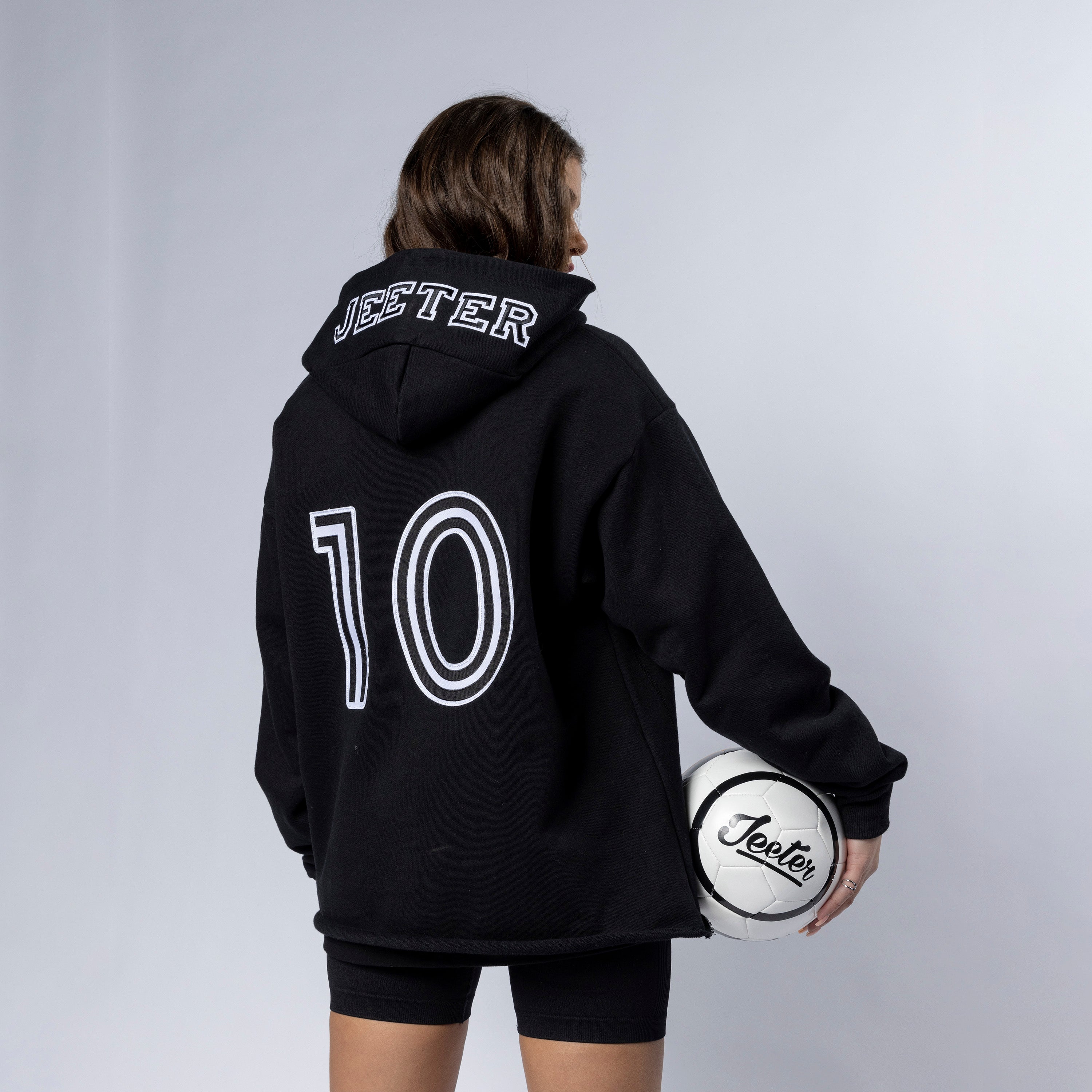 Heavier weight hoodie with 3 piece hood construction featuring game logo applique on the hood, small Jeeter FC crest patch at center front, hidden #10 patch with kangaroo pocket and raw edge hem.
